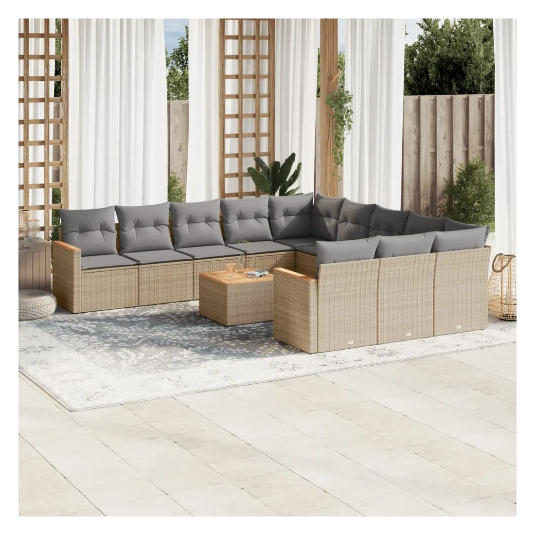 Cet ensemble de canapés de jardin est le complément parfait de votre arrière-cour, terrasse ou patio, offrant un espace confortable et accueillant pour discuter avec la famille et les amis ou simplement se détendre et profiter de l'extérieur. Matériau durable : la résine tressée, également connue sous le nom de poly rotin, est un matériau synthétique solide et nécessitant peu d'entretien qui ressemble au rotin naturel. Il est léger, facile à nettoyer et couramment utilisé pour les meubles d'extérieur en raison de sa durabilité et de ses propriétés de résistance aux intempéries.Dessus stable et facile à nettoyer : cette table de jardin a un dessus en bois d'acacia robuste, durable et facile à nettoyer avec un chiffon humide.Housse amovible et lavable : ces coussins de siège sont dotés de housses amovibles pour un lavage et un entretien faciles.Cadre robuste et stable : le cadre en acier enduit de poudre assure la solidité et la stabilité du meuble de jardin pour une utilisation quotidienne à l'extérieur.Conception modulaire : cet ensemble de meubles d'extérieur a une conception modulaire, ce qui le rend complètement flexible et facile à déplacer, afin que vous puissiez créer un agencement de meubles d'extérieur personnalisé. Bon à savoir :Pour que vos meubles d'extérieur restent beaux, nous vous recommandons de les protéger avec une housse imperméable.