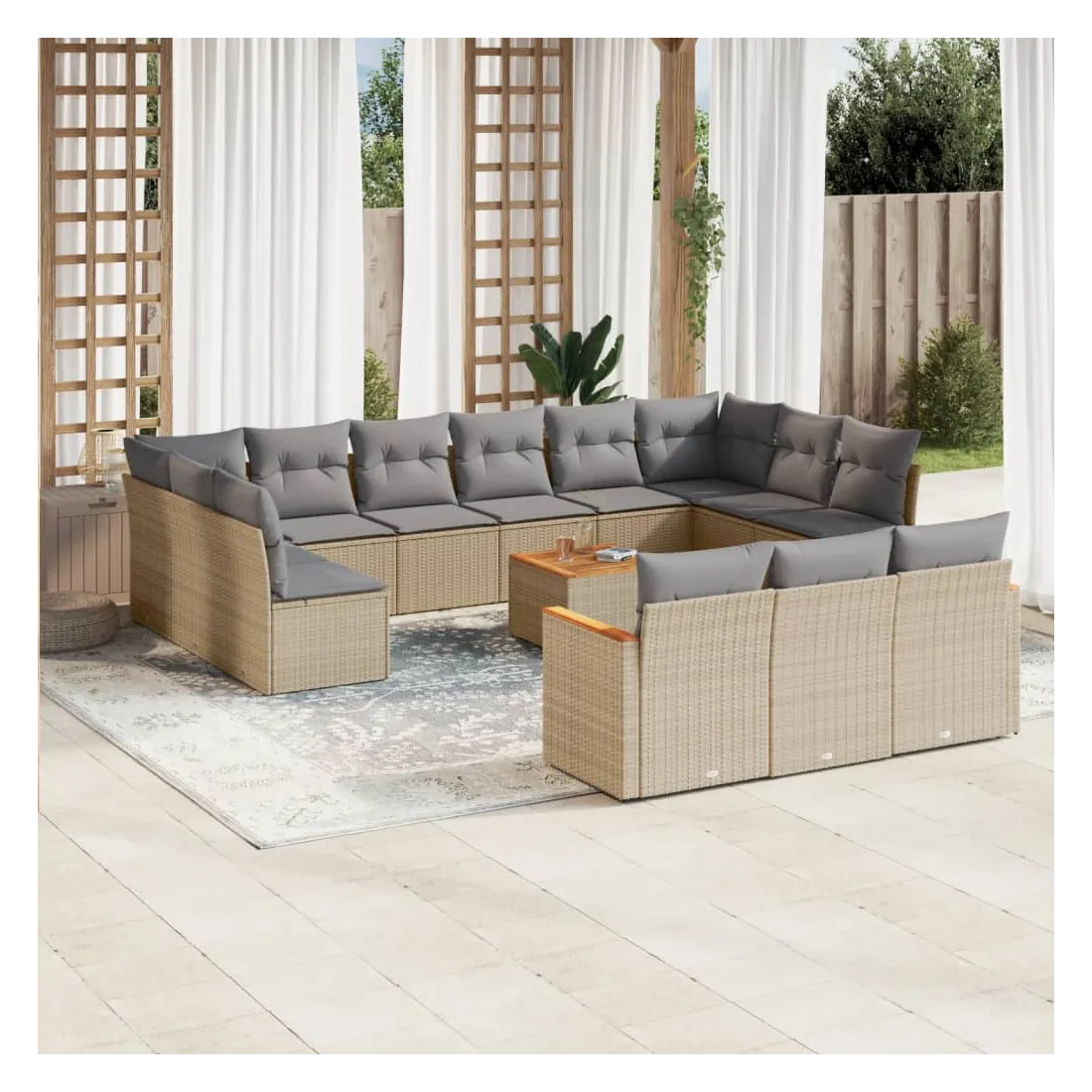 Cet ensemble de canapés de jardin est le complément parfait de votre arrière-cour, terrasse ou patio, offrant un espace confortable et accueillant pour discuter avec la famille et les amis ou simplement se détendre et profiter de l'extérieur. Matériau durable : la résine tressée, également connue sous le nom de poly rotin, est un matériau synthétique solide et nécessitant peu d'entretien qui ressemble au rotin naturel. Il est léger, facile à nettoyer et couramment utilisé pour les meubles d'extérieur en raison de sa durabilité et de ses propriétés de résistance aux intempéries.Dessus stable et facile à nettoyer : cette table de jardin a un dessus en bois d'acacia robuste, durable et facile à nettoyer avec un chiffon humide.Housse amovible et lavable : ces coussins de siège sont dotés de housses amovibles pour un lavage et un entretien faciles.Cadre robuste et stable : le cadre en acier enduit de poudre assure la solidité et la stabilité du meuble de jardin pour une utilisation quotidienne à l'extérieur.Conception modulaire : cet ensemble de meubles d'extérieur a une conception modulaire, ce qui le rend complètement flexible et facile à déplacer, afin que vous puissiez créer un agencement de meubles d'extérieur personnalisé. Bon à savoir :Pour que vos meubles d'extérieur restent beaux, nous vous recommandons de les protéger avec une housse imperméable.