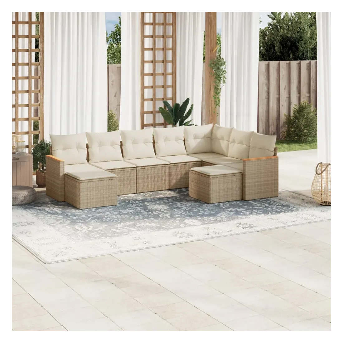 Cet ensemble de canapés de jardin est le complément parfait de votre arrière-cour, terrasse ou patio, offrant un espace confortable et accueillant pour discuter avec la famille et les amis ou simplement se détendre et profiter de l'extérieur. Matériau durable : la résine tressée, également connue sous le nom de poly rotin, est un matériau synthétique solide et nécessitant peu d'entretien qui ressemble au rotin naturel. Il est léger, facile à nettoyer et couramment utilisé pour les meubles d'extérieur en raison de sa durabilité et de ses propriétés de résistance aux intempéries.Housse amovible et lavable : ces coussins de siège sont dotés de housses amovibles pour un lavage et un entretien faciles.Cadre robuste et stable : le cadre en acier enduit de poudre assure la solidité et la stabilité du meuble de jardin pour une utilisation quotidienne à l'extérieur.Conception modulaire : cet ensemble de meubles d'extérieur a une conception modulaire, ce qui le rend complètement flexible et facile à déplacer, afin que vous puissiez créer un agencement de meubles d'extérieur personnalisé. Bon à savoir :Pour que vos meubles d'extérieur restent beaux, nous vous recommandons de les protéger avec une housse imperméable.