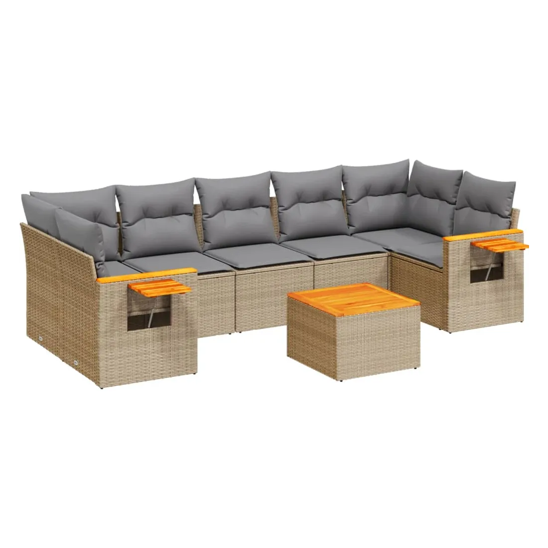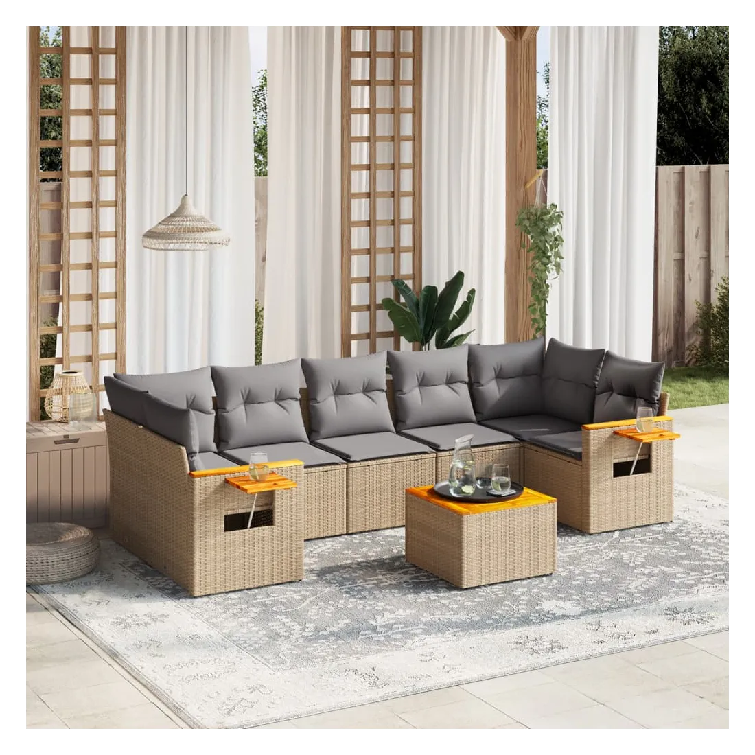 Cet ensemble de canapés de jardin est le complément parfait de votre arrière-cour, terrasse ou patio, offrant un espace confortable et accueillant pour discuter avec la famille et les amis ou simplement se détendre et profiter de l'extérieur. Matériau durable : la résine tressée, également connue sous le nom de poly rotin, est un matériau synthétique solide et nécessitant peu d'entretien qui ressemble au rotin naturel. Il est léger, facile à nettoyer et couramment utilisé pour les meubles d'extérieur en raison de sa durabilité et de ses propriétés de résistance aux intempéries.Dessus stable et facile à nettoyer : cette table de jardin a un dessus en bois d'acacia robuste, durable et facile à nettoyer avec un chiffon humide.Table d'appoint pratique : ce mobilier d'extérieur comprend une table d'appoint pliable avec un ressort à gaz sur les accoudoirs, offrant un endroit pratique pour garder vos essentiels à portée de main.Housse amovible et lavable : ces coussins de siège sont dotés de housses amovibles pour un lavage et un entretien faciles.Conception modulaire : cet ensemble de meubles d'extérieur a une conception modulaire, ce qui le rend complètement flexible et facile à déplacer, afin que vous puissiez créer un agencement de meubles d'extérieur personnalisé. Bon à savoir :Pour que vos meubles d'extérieur restent beaux, nous vous recommandons de les protéger avec une housse imperméable.