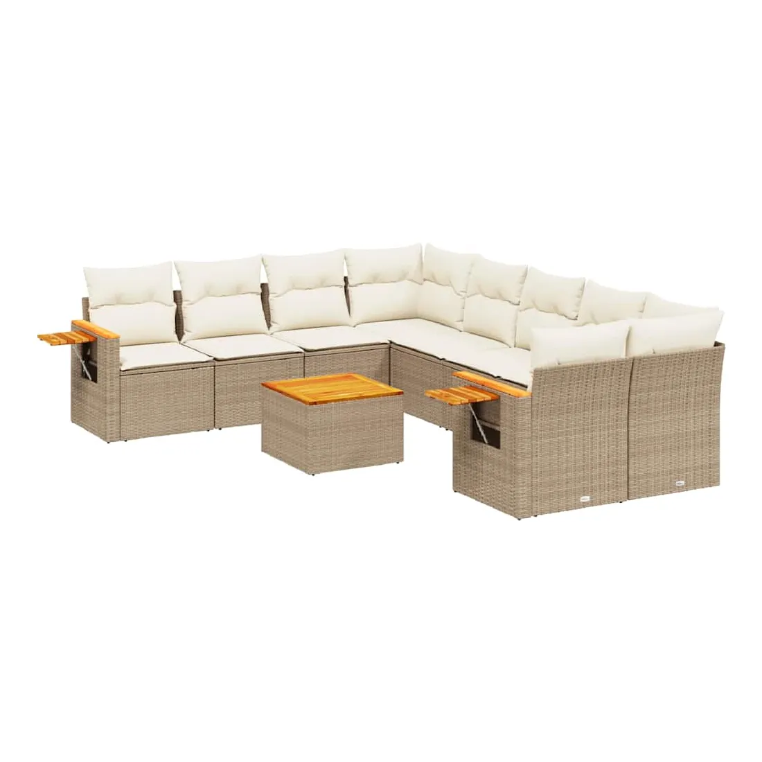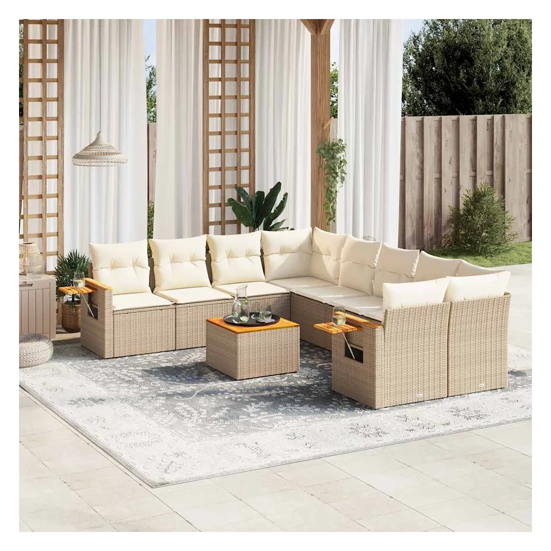 Cet ensemble de canapés de jardin est le complément parfait de votre arrière-cour, terrasse ou patio, offrant un espace confortable et accueillant pour discuter avec la famille et les amis ou simplement se détendre et profiter de l'extérieur. Matériau durable : la résine tressée, également connue sous le nom de poly rotin, est un matériau synthétique solide et nécessitant peu d'entretien qui ressemble au rotin naturel. Il est léger, facile à nettoyer et couramment utilisé pour les meubles d'extérieur en raison de sa durabilité et de ses propriétés de résistance aux intempéries.Dessus stable et facile à nettoyer : cette table de jardin a un dessus en bois d'acacia robuste, durable et facile à nettoyer avec un chiffon humide.Table d'appoint pratique : ce mobilier d'extérieur comprend une table d'appoint pliable avec un ressort à gaz sur les accoudoirs, offrant un endroit pratique pour garder vos essentiels à portée de main.Housse amovible et lavable : ces coussins de siège sont dotés de housses amovibles pour un lavage et un entretien faciles.Conception modulaire : cet ensemble de meubles d'extérieur a une conception modulaire, ce qui le rend complètement flexible et facile à déplacer, afin que vous puissiez créer un agencement de meubles d'extérieur personnalisé. Bon à savoir :Pour que vos meubles d'extérieur restent beaux, nous vous recommandons de les protéger avec une housse imperméable.
