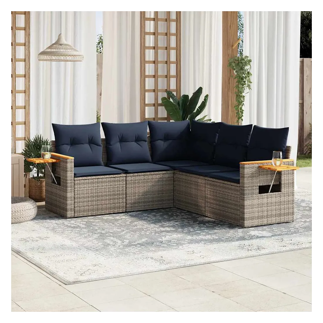 Cet ensemble de canapés de jardin est le complément parfait de votre arrière-cour, terrasse ou patio, offrant un espace confortable et accueillant pour discuter avec la famille et les amis ou simplement se détendre et profiter de l'extérieur. Matériau durable : la résine tressée, également connue sous le nom de poly rotin, est un matériau synthétique solide et nécessitant peu d'entretien qui ressemble au rotin naturel. Il est léger, facile à nettoyer et couramment utilisé pour les meubles d'extérieur en raison de sa durabilité et de ses propriétés de résistance aux intempéries.Table d'appoint pratique : ce mobilier d'extérieur comprend une table d'appoint pliable avec un ressort à gaz sur les accoudoirs, offrant un endroit pratique pour garder vos essentiels à portée de main.Housse amovible et lavable : ces coussins de siège sont dotés de housses amovibles pour un lavage et un entretien faciles.Conception modulaire : cet ensemble de meubles d'extérieur a une conception modulaire, ce qui le rend complètement flexible et facile à déplacer, afin que vous puissiez créer un agencement de meubles d'extérieur personnalisé. Bon à savoir :Pour que vos meubles d'extérieur restent beaux, nous vous recommandons de les protéger avec une housse imperméable.