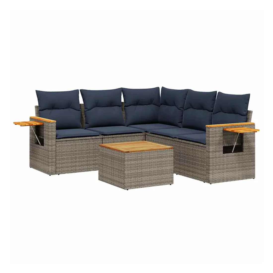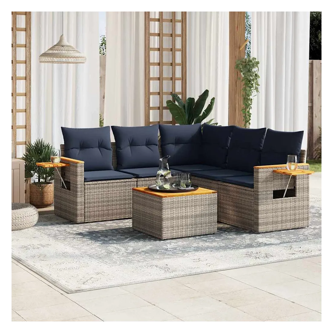 Cet ensemble de canapés de jardin est le complément parfait de votre arrière-cour, terrasse ou patio, offrant un espace confortable et accueillant pour discuter avec la famille et les amis ou simplement se détendre et profiter de l'extérieur. Matériau durable : la résine tressée, également connue sous le nom de poly rotin, est un matériau synthétique solide et nécessitant peu d'entretien qui ressemble au rotin naturel. Il est léger, facile à nettoyer et couramment utilisé pour les meubles d'extérieur en raison de sa durabilité et de ses propriétés de résistance aux intempéries.Dessus stable et facile à nettoyer : cette table de jardin a un dessus en bois d'acacia robuste, durable et facile à nettoyer avec un chiffon humide.Table d'appoint pratique : ce mobilier d'extérieur comprend une table d'appoint pliable avec un ressort à gaz sur les accoudoirs, offrant un endroit pratique pour garder vos essentiels à portée de main.Housse amovible et lavable : ces coussins de siège sont dotés de housses amovibles pour un lavage et un entretien faciles.Conception modulaire : cet ensemble de meubles d'extérieur a une conception modulaire, ce qui le rend complètement flexible et facile à déplacer, afin que vous puissiez créer un agencement de meubles d'extérieur personnalisé. Bon à savoir :Pour que vos meubles d'extérieur restent beaux, nous vous recommandons de les protéger avec une housse imperméable.