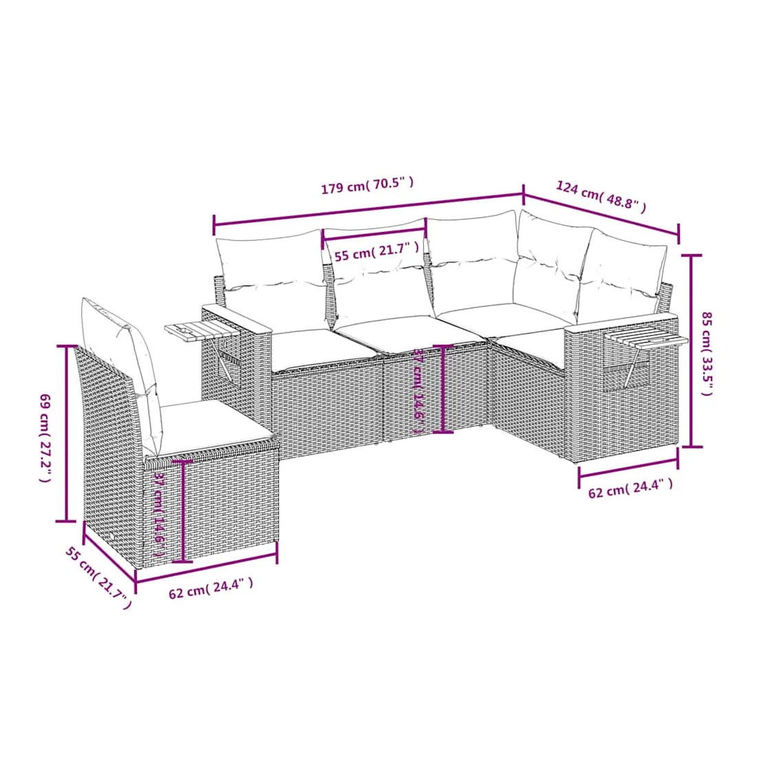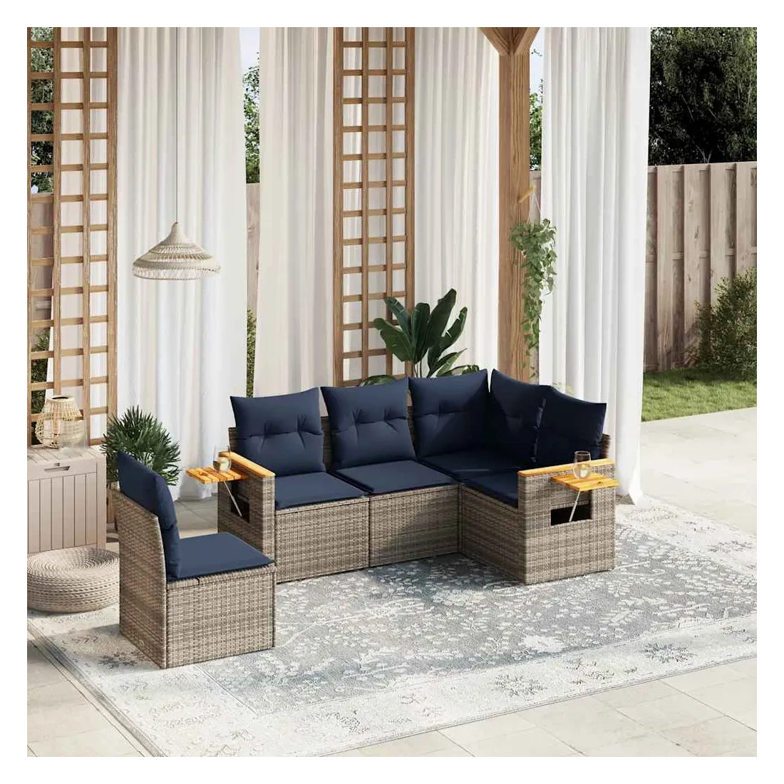 Cet ensemble de canapés de jardin est le complément parfait de votre arrière-cour, terrasse ou patio, offrant un espace confortable et accueillant pour discuter avec la famille et les amis ou simplement se détendre et profiter de l'extérieur. Matériau durable : la résine tressée, également connue sous le nom de poly rotin, est un matériau synthétique solide et nécessitant peu d'entretien qui ressemble au rotin naturel. Il est léger, facile à nettoyer et couramment utilisé pour les meubles d'extérieur en raison de sa durabilité et de ses propriétés de résistance aux intempéries.Table d'appoint pratique : ce mobilier d'extérieur comprend une table d'appoint pliable avec un ressort à gaz sur les accoudoirs, offrant un endroit pratique pour garder vos essentiels à portée de main.Housse amovible et lavable : ces coussins de siège sont dotés de housses amovibles pour un lavage et un entretien faciles.Conception modulaire : cet ensemble de meubles d'extérieur a une conception modulaire, ce qui le rend complètement flexible et facile à déplacer, afin que vous puissiez créer un agencement de meubles d'extérieur personnalisé. Bon à savoir :Pour que vos meubles d'extérieur restent beaux, nous vous recommandons de les protéger avec une housse imperméable.
