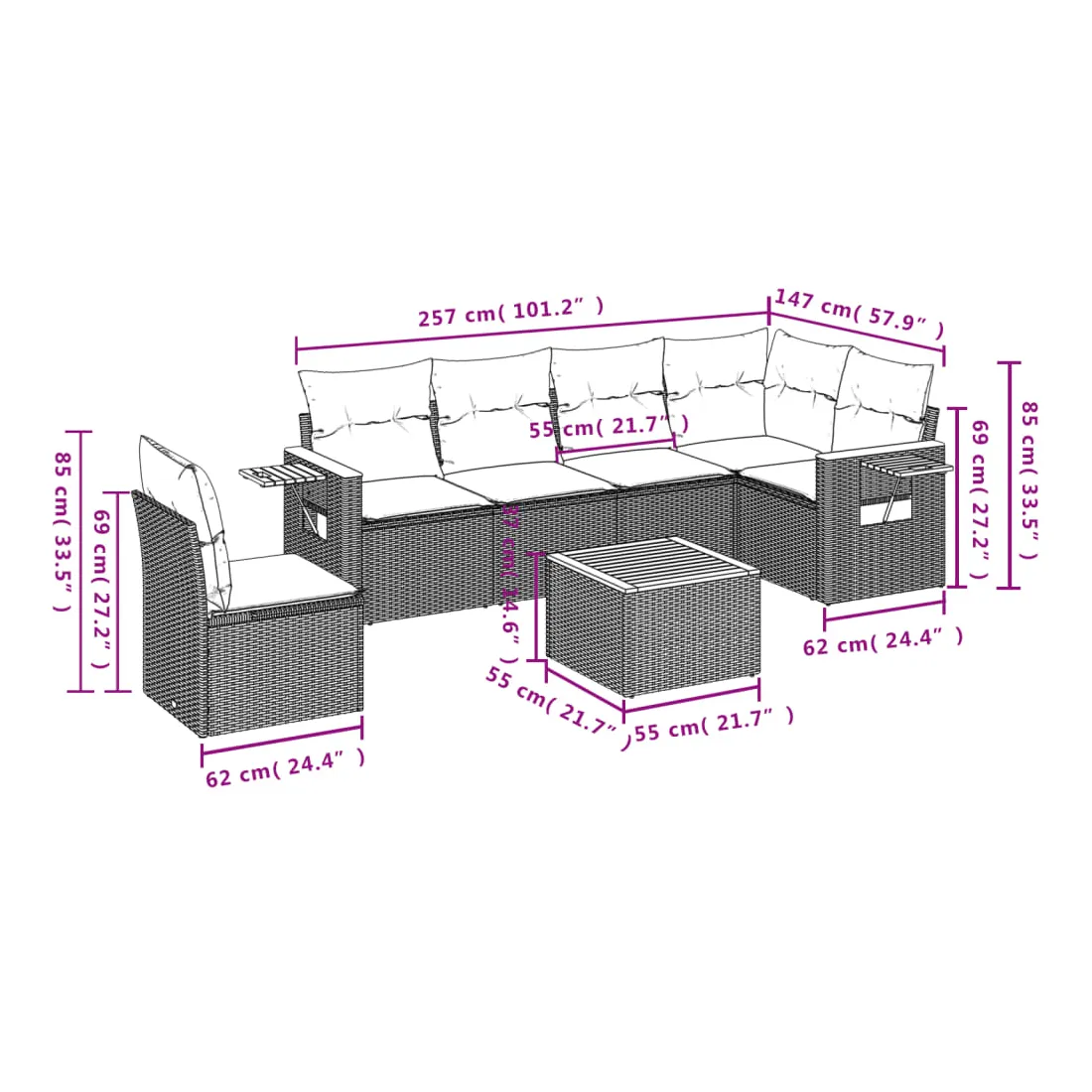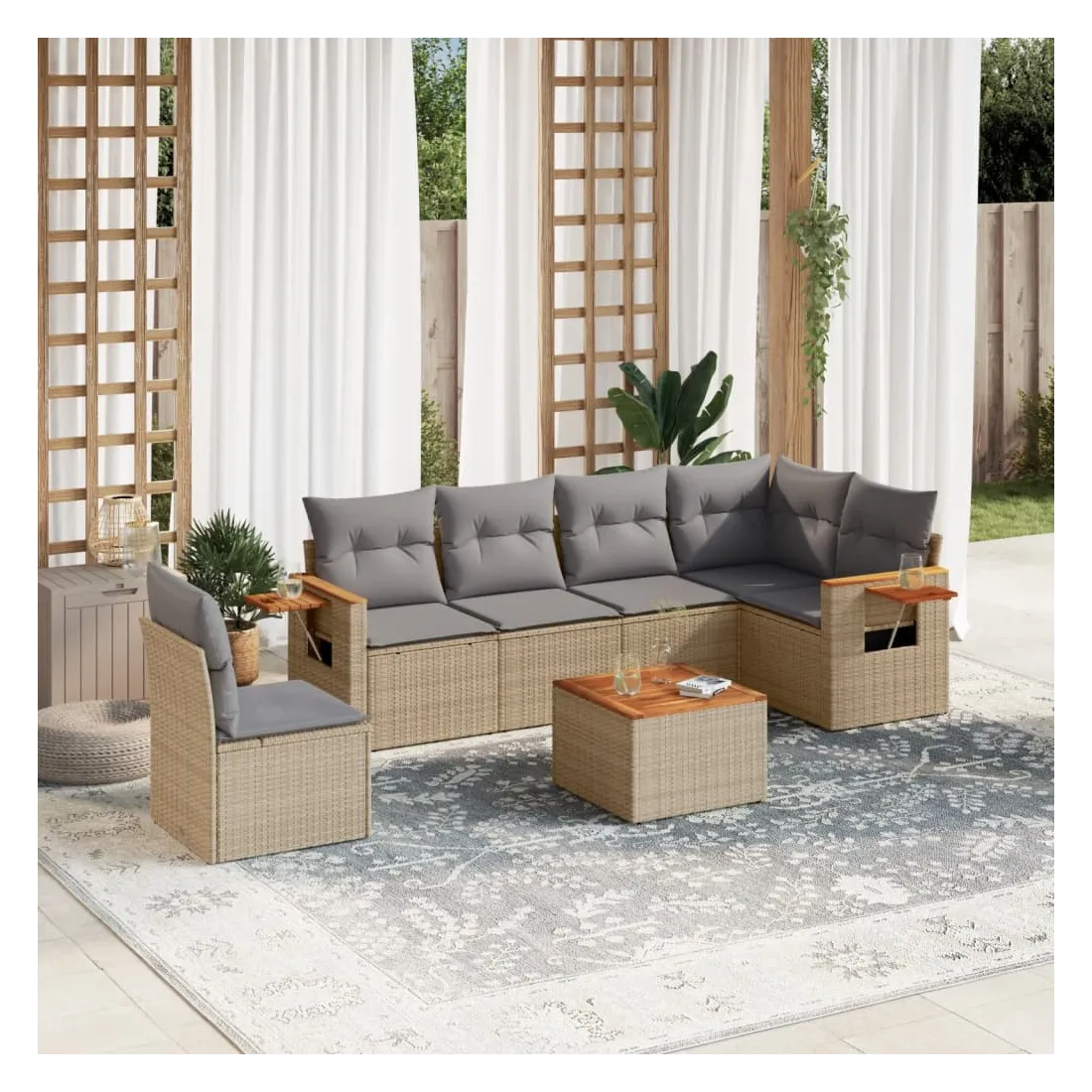 Cet ensemble de canapés de jardin est le complément parfait de votre arrière-cour, terrasse ou patio, offrant un espace confortable et accueillant pour discuter avec la famille et les amis ou simplement se détendre et profiter de l'extérieur. Matériau durable : la résine tressée, également connue sous le nom de poly rotin, est un matériau synthétique solide et nécessitant peu d'entretien qui ressemble au rotin naturel. Il est léger, facile à nettoyer et couramment utilisé pour les meubles d'extérieur en raison de sa durabilité et de ses propriétés de résistance aux intempéries.Dessus stable et facile à nettoyer : cette table de jardin a un dessus en bois d'acacia robuste, durable et facile à nettoyer avec un chiffon humide.Table d'appoint pratique : ce mobilier d'extérieur comprend une table d'appoint pliable avec un ressort à gaz sur les accoudoirs, offrant un endroit pratique pour garder vos essentiels à portée de main.Housse amovible et lavable : ces coussins de siège sont dotés de housses amovibles pour un lavage et un entretien faciles.Conception modulaire : cet ensemble de meubles d'extérieur a une conception modulaire, ce qui le rend complètement flexible et facile à déplacer, afin que vous puissiez créer un agencement de meubles d'extérieur personnalisé. Bon à savoir :Pour que vos meubles d'extérieur restent beaux, nous vous recommandons de les protéger avec une housse imperméable.
