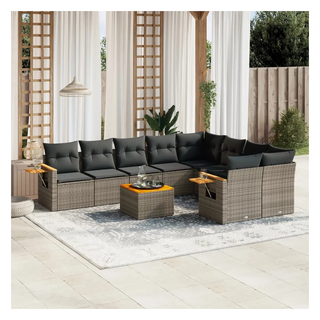 Cet ensemble de canapés de jardin est le complément parfait de votre arrière-cour, terrasse ou patio, offrant un espace confortable et accueillant pour discuter avec la famille et les amis ou simplement se détendre et profiter de l'extérieur. Matériau durable : la résine tressée, également connue sous le nom de poly rotin, est un matériau synthétique solide et nécessitant peu d'entretien qui ressemble au rotin naturel. Il est léger, facile à nettoyer et couramment utilisé pour les meubles d'extérieur en raison de sa durabilité et de ses propriétés de résistance aux intempéries.Dessus stable et facile à nettoyer : cette table de jardin a un dessus en bois d'acacia robuste, durable et facile à nettoyer avec un chiffon humide.Table d'appoint pratique : ce mobilier d'extérieur comprend une table d'appoint pliable avec un ressort à gaz sur les accoudoirs, offrant un endroit pratique pour garder vos essentiels à portée de main.Housse amovible et lavable : ces coussins de siège sont dotés de housses amovibles pour un lavage et un entretien faciles.Conception modulaire : cet ensemble de meubles d'extérieur a une conception modulaire, ce qui le rend complètement flexible et facile à déplacer, afin que vous puissiez créer un agencement de meubles d'extérieur personnalisé. Bon à savoir :Pour que vos meubles d'extérieur restent beaux, nous vous recommandons de les protéger avec une housse imperméable.