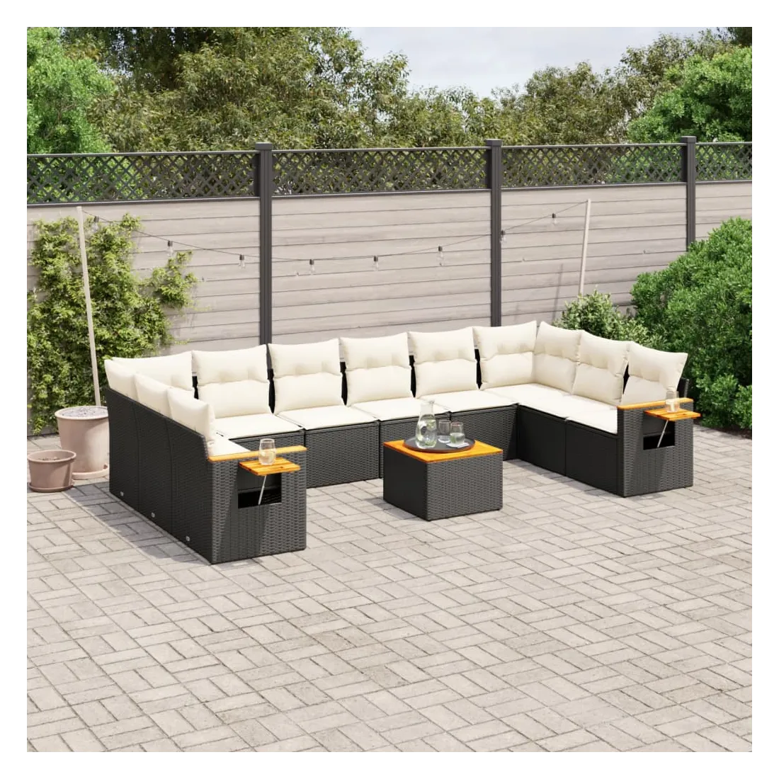 Cet ensemble de canapés de jardin est le complément parfait de votre arrière-cour, terrasse ou patio, offrant un espace confortable et accueillant pour discuter avec la famille et les amis ou simplement se détendre et profiter de l'extérieur. Matériau durable : la résine tressée, également connue sous le nom de poly rotin, est un matériau synthétique solide et nécessitant peu d'entretien qui ressemble au rotin naturel. Il est léger, facile à nettoyer et couramment utilisé pour les meubles d'extérieur en raison de sa durabilité et de ses propriétés de résistance aux intempéries.Dessus stable et facile à nettoyer : cette table de jardin a un dessus en bois d'acacia robuste, durable et facile à nettoyer avec un chiffon humide.Table d'appoint pratique : ce mobilier d'extérieur comprend une table d'appoint pliable avec un ressort à gaz sur les accoudoirs, offrant un endroit pratique pour garder vos essentiels à portée de main.Housse amovible et lavable : ces coussins de siège sont dotés de housses amovibles pour un lavage et un entretien faciles.Conception modulaire : cet ensemble de meubles d'extérieur a une conception modulaire, ce qui le rend complètement flexible et facile à déplacer, afin que vous puissiez créer un agencement de meubles d'extérieur personnalisé. Bon à savoir :Pour que vos meubles d'extérieur restent beaux, nous vous recommandons de les protéger avec une housse imperméable.