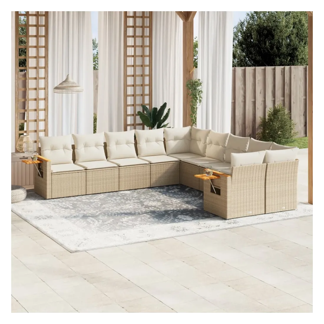 Cet ensemble de canapés de jardin est le complément parfait de votre arrière-cour, terrasse ou patio, offrant un espace confortable et accueillant pour discuter avec la famille et les amis ou simplement se détendre et profiter de l'extérieur. Matériau durable : la résine tressée, également connue sous le nom de poly rotin, est un matériau synthétique solide et nécessitant peu d'entretien qui ressemble au rotin naturel. Il est léger, facile à nettoyer et couramment utilisé pour les meubles d'extérieur en raison de sa durabilité et de ses propriétés de résistance aux intempéries.Table d'appoint pratique : ce mobilier d'extérieur comprend une table d'appoint pliable avec un ressort à gaz sur les accoudoirs, offrant un endroit pratique pour garder vos essentiels à portée de main.Housse amovible et lavable : ces coussins de siège sont dotés de housses amovibles pour un lavage et un entretien faciles.Conception modulaire : cet ensemble de meubles d'extérieur a une conception modulaire, ce qui le rend complètement flexible et facile à déplacer, afin que vous puissiez créer un agencement de meubles d'extérieur personnalisé. Bon à savoir :Pour que vos meubles d'extérieur restent beaux, nous vous recommandons de les protéger avec une housse imperméable.