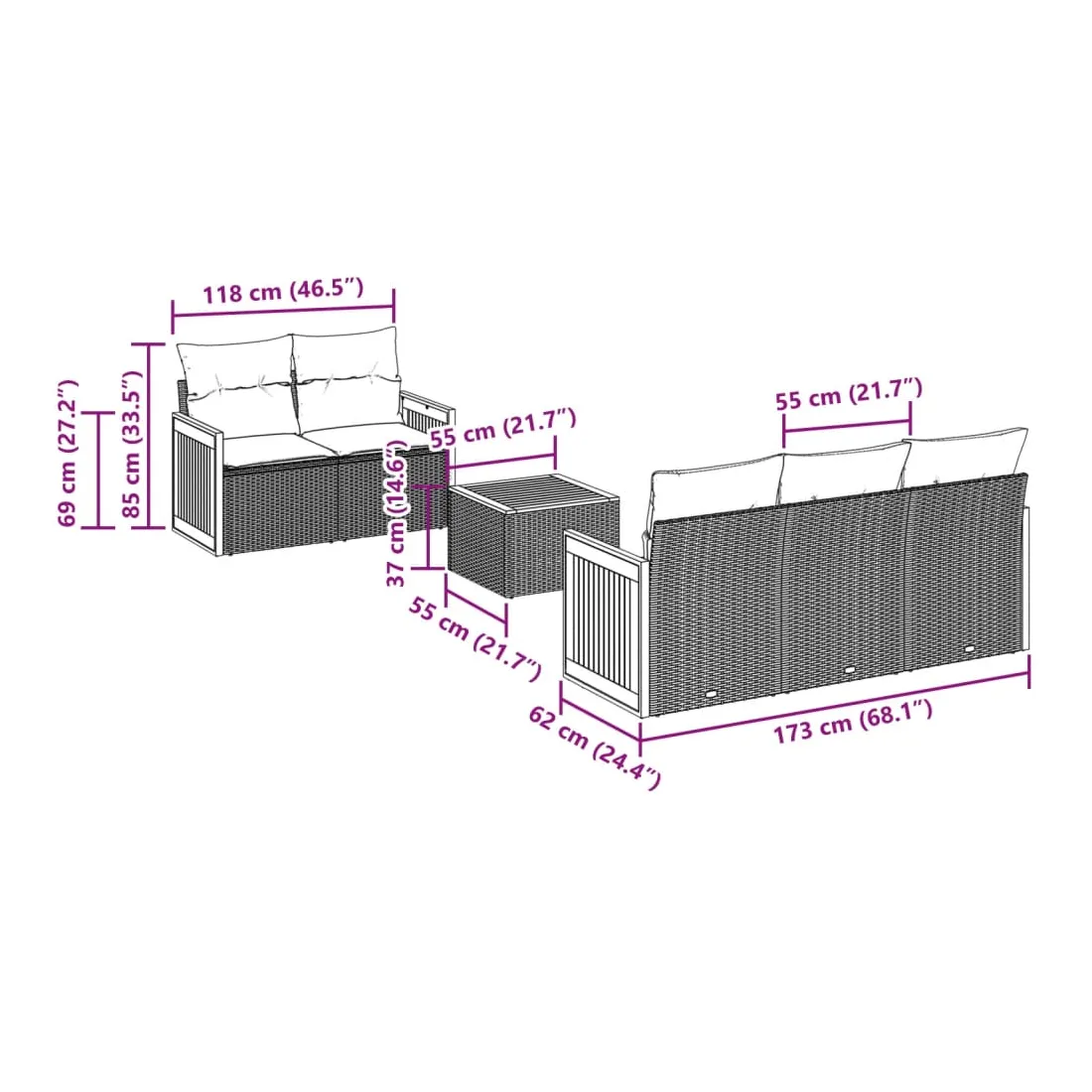 Cet ensemble de canapés de jardin est le complément parfait de votre arrière-cour, terrasse ou patio, offrant un espace confortable et accueillant pour discuter avec la famille et les amis ou simplement se détendre et profiter de l'extérieur. Matériau durable : la résine tressée, également connue sous le nom de poly rotin, est un matériau synthétique solide et nécessitant peu d'entretien qui ressemble au rotin naturel. Il est léger, facile à nettoyer et couramment utilisé pour les meubles d'extérieur en raison de sa durabilité et de ses propriétés de résistance aux intempéries.Expérience d'assise confortable : ce mobilier d'extérieur, doté de coussins épais, offre une expérience d'assise confortable.Dessus stable et facile à nettoyer : cette table de jardin a un dessus en bois d'acacia robuste, durable et facile à nettoyer avec un chiffon humide.Housse amovible et lavable : ces coussins de siège sont dotés de housses amovibles pour un lavage et un entretien faciles.Conception modulaire : cet ensemble de meubles d'extérieur a une conception modulaire, ce qui le rend complètement flexible et facile à déplacer, afin que vous puissiez créer un agencement de meubles d'extérieur personnalisé. Bon à savoir :Pour que vos meubles d'extérieur restent beaux, nous vous recommandons de les protéger avec une housse imperméable.