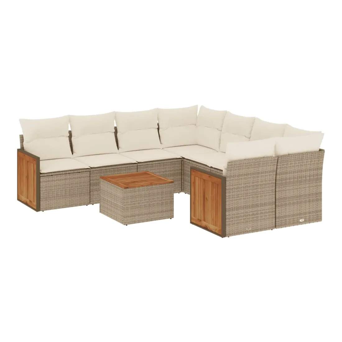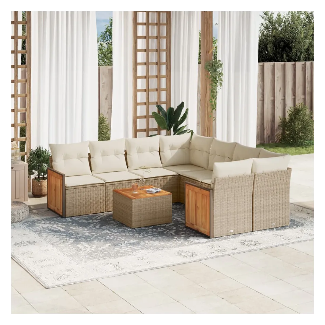 Cet ensemble de canapés de jardin est le complément parfait de votre arrière-cour, terrasse ou patio, offrant un espace confortable et accueillant pour discuter avec la famille et les amis ou simplement se détendre et profiter de l'extérieur. Matériau durable : la résine tressée, également connue sous le nom de poly rotin, est un matériau synthétique solide et nécessitant peu d'entretien qui ressemble au rotin naturel. Il est léger, facile à nettoyer et couramment utilisé pour les meubles d'extérieur en raison de sa durabilité et de ses propriétés de résistance aux intempéries.Expérience d'assise confortable : ce mobilier d'extérieur, doté de coussins épais, offre une expérience d'assise confortable.Dessus stable et facile à nettoyer : cette table de jardin a un dessus en bois d'acacia robuste, durable et facile à nettoyer avec un chiffon humide.Housse amovible et lavable : ces coussins de siège sont dotés de housses amovibles pour un lavage et un entretien faciles.Conception modulaire : cet ensemble de meubles d'extérieur a une conception modulaire, ce qui le rend complètement flexible et facile à déplacer, afin que vous puissiez créer un agencement de meubles d'extérieur personnalisé. Bon à savoir :Pour que vos meubles d'extérieur restent beaux, nous vous recommandons de les protéger avec une housse imperméable.