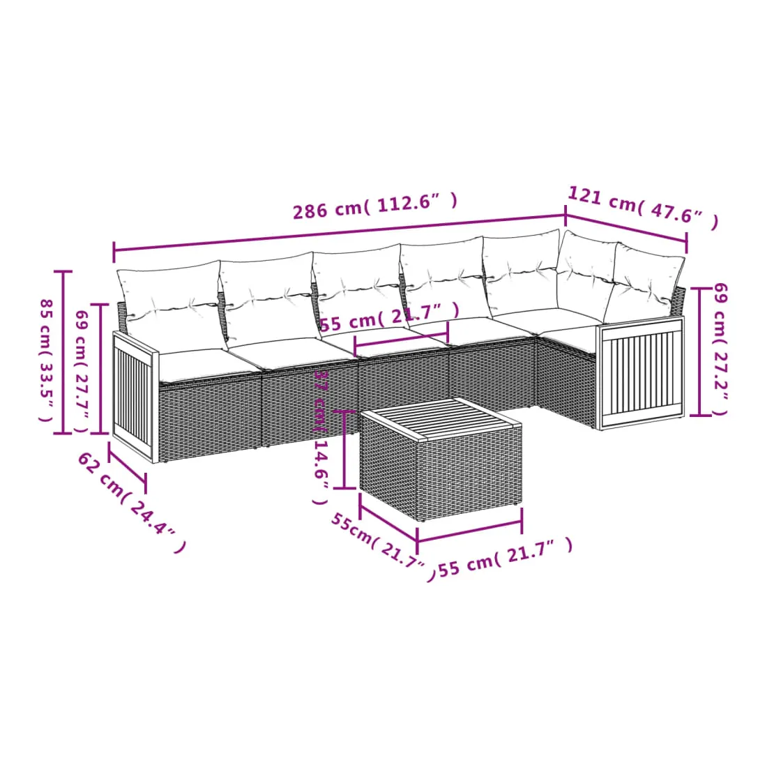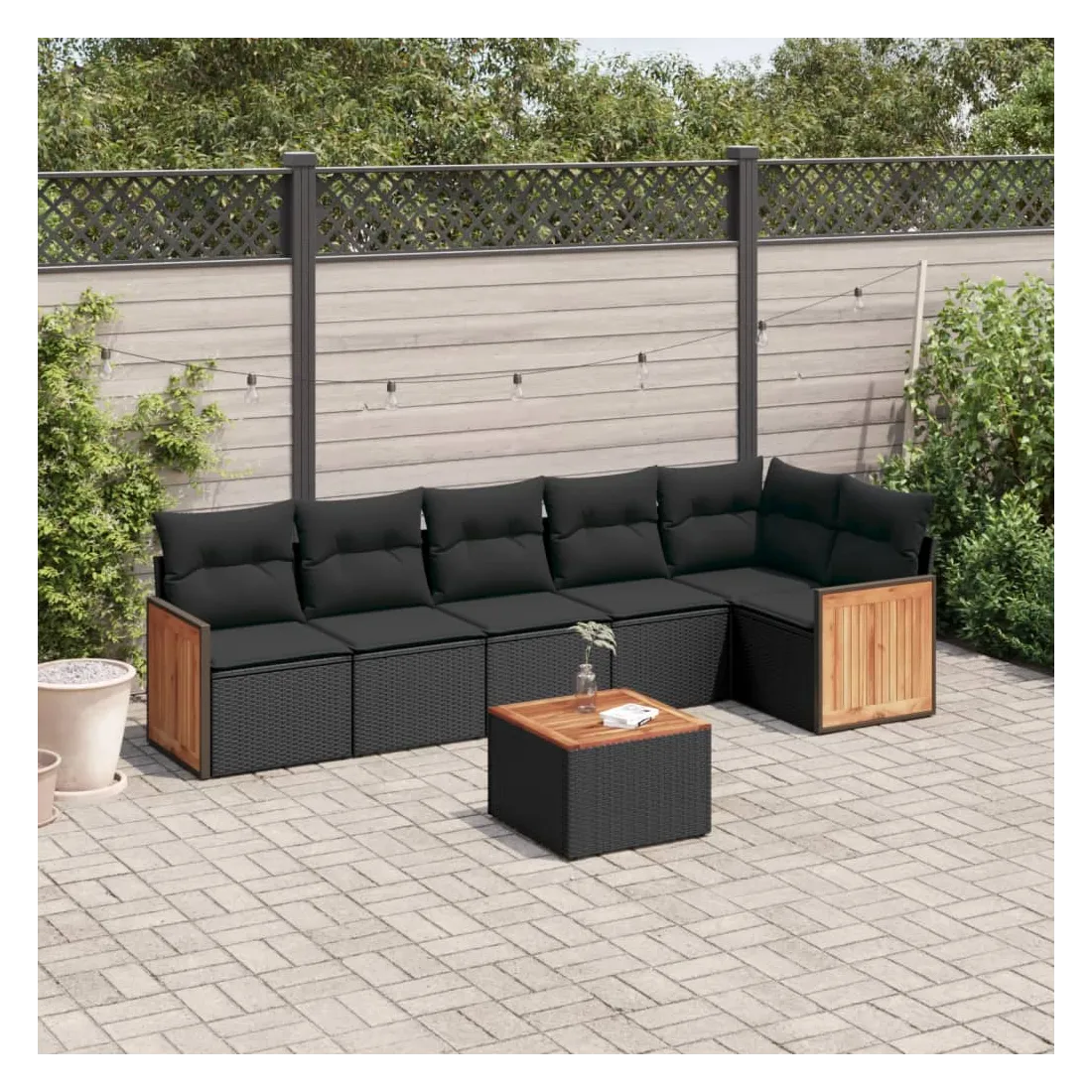 Cet ensemble de canapés de jardin est le complément parfait de votre arrière-cour, terrasse ou patio, offrant un espace confortable et accueillant pour discuter avec la famille et les amis ou simplement se détendre et profiter de l'extérieur. Matériau durable : la résine tressée, également connue sous le nom de poly rotin, est un matériau synthétique solide et nécessitant peu d'entretien qui ressemble au rotin naturel. Il est léger, facile à nettoyer et couramment utilisé pour les meubles d'extérieur en raison de sa durabilité et de ses propriétés de résistance aux intempéries.Expérience d'assise confortable : ce mobilier d'extérieur, doté de coussins épais, offre une expérience d'assise confortable.Dessus stable et facile à nettoyer : cette table de jardin a un dessus en bois d'acacia robuste, durable et facile à nettoyer avec un chiffon humide.Housse amovible et lavable : ces coussins de siège sont dotés de housses amovibles pour un lavage et un entretien faciles.Conception modulaire : cet ensemble de meubles d'extérieur a une conception modulaire, ce qui le rend complètement flexible et facile à déplacer, afin que vous puissiez créer un agencement de meubles d'extérieur personnalisé. Bon à savoir :Pour que vos meubles d'extérieur restent beaux, nous vous recommandons de les protéger avec une housse imperméable.