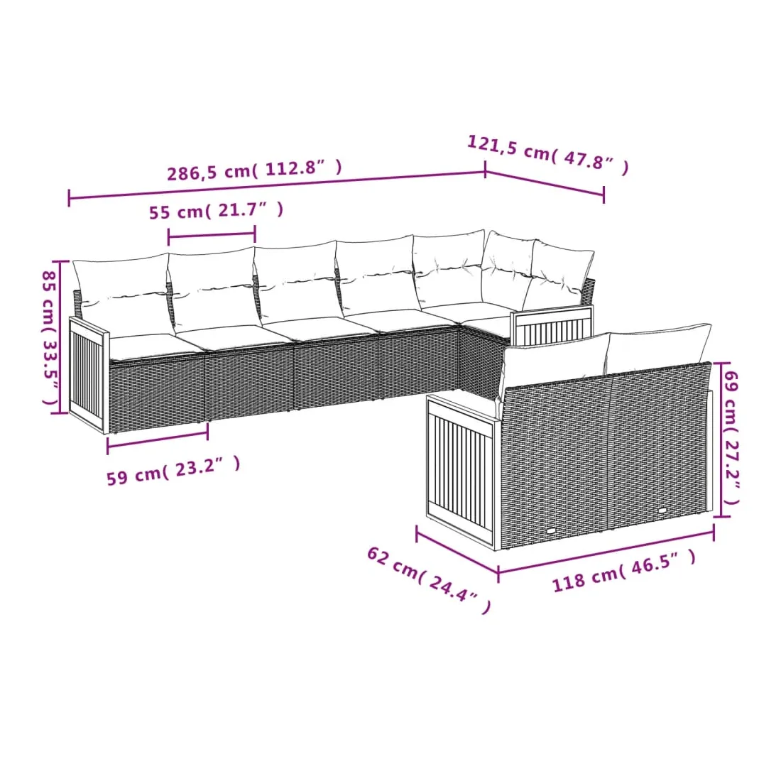 - 8 x coussin d'assise avec housse amovible et lavable