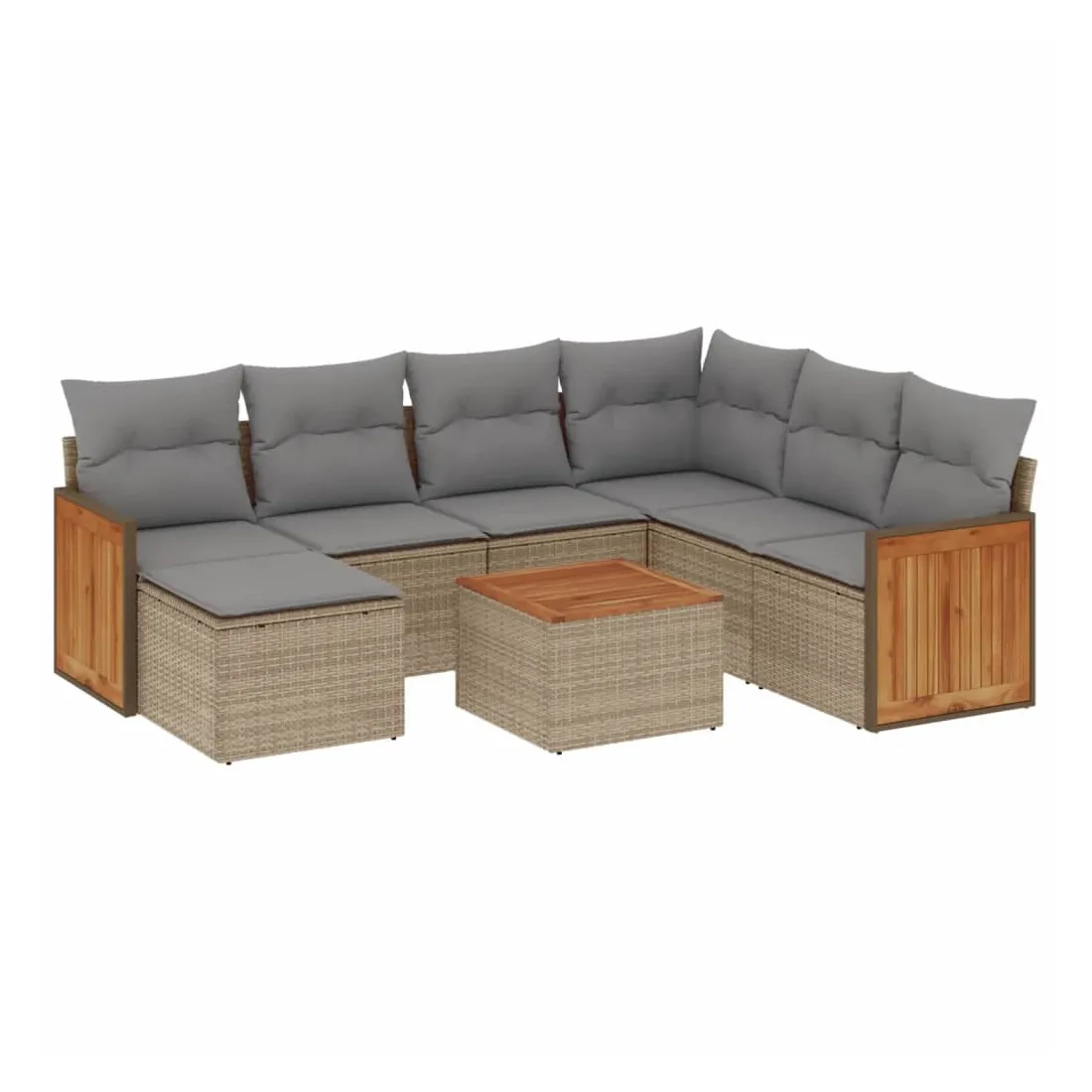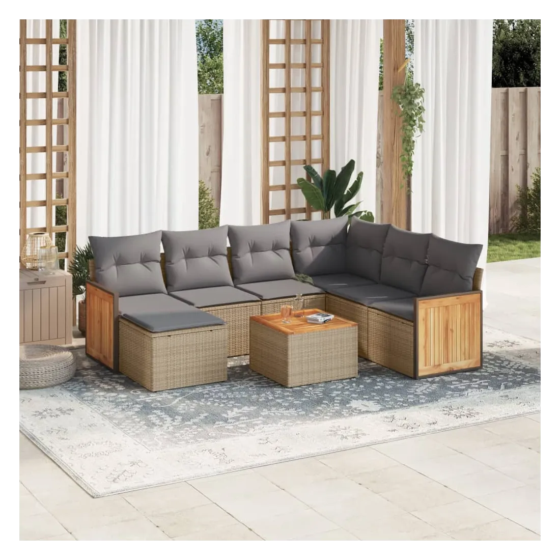 Cet ensemble de canapés de jardin est le complément parfait de votre arrière-cour, terrasse ou patio, offrant un espace confortable et accueillant pour discuter avec la famille et les amis ou simplement se détendre et profiter de l'extérieur. Matériau durable : la résine tressée, également connue sous le nom de poly rotin, est un matériau synthétique solide et nécessitant peu d'entretien qui ressemble au rotin naturel. Il est léger, facile à nettoyer et couramment utilisé pour les meubles d'extérieur en raison de sa durabilité et de ses propriétés de résistance aux intempéries.Expérience d'assise confortable : ce mobilier d'extérieur, doté de coussins épais, offre une expérience d'assise confortable.Dessus stable et facile à nettoyer : cette table de jardin a un dessus en bois d'acacia robuste, durable et facile à nettoyer avec un chiffon humide.Housse amovible et lavable : ces coussins de siège sont dotés de housses amovibles pour un lavage et un entretien faciles.Conception modulaire : cet ensemble de meubles d'extérieur a une conception modulaire, ce qui le rend complètement flexible et facile à déplacer, afin que vous puissiez créer un agencement de meubles d'extérieur personnalisé. Bon à savoir :Pour que vos meubles d'extérieur restent beaux, nous vous recommandons de les protéger avec une housse imperméable.