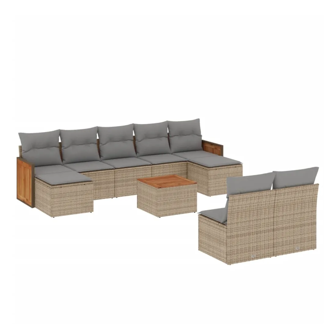 Cet ensemble de canapés de jardin est le complément parfait de votre arrière-cour, terrasse ou patio, offrant un espace confortable et accueillant pour discuter avec la famille et les amis ou simplement se détendre et profiter de l'extérieur. Matériau durable : la résine tressée, également connue sous le nom de poly rotin, est un matériau synthétique solide et nécessitant peu d'entretien qui ressemble au rotin naturel. Il est léger, facile à nettoyer et couramment utilisé pour les meubles d'extérieur en raison de sa durabilité et de ses propriétés de résistance aux intempéries.Expérience d'assise confortable : ce mobilier d'extérieur, doté de coussins épais, offre une expérience d'assise confortable.Dessus stable et facile à nettoyer : cette table de jardin a un dessus en bois d'acacia robuste, durable et facile à nettoyer avec un chiffon humide.Housse amovible et lavable : ces coussins de siège sont dotés de housses amovibles pour un lavage et un entretien faciles.Conception modulaire : cet ensemble de meubles d'extérieur a une conception modulaire, ce qui le rend complètement flexible et facile à déplacer, afin que vous puissiez créer un agencement de meubles d'extérieur personnalisé. Bon à savoir :Pour que vos meubles d'extérieur restent beaux, nous vous recommandons de les protéger avec une housse imperméable.