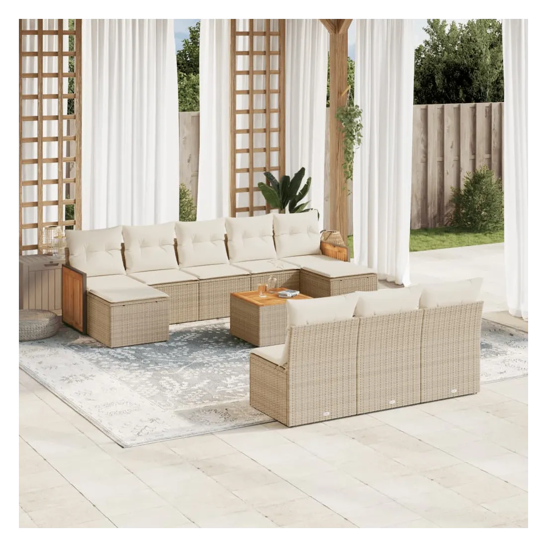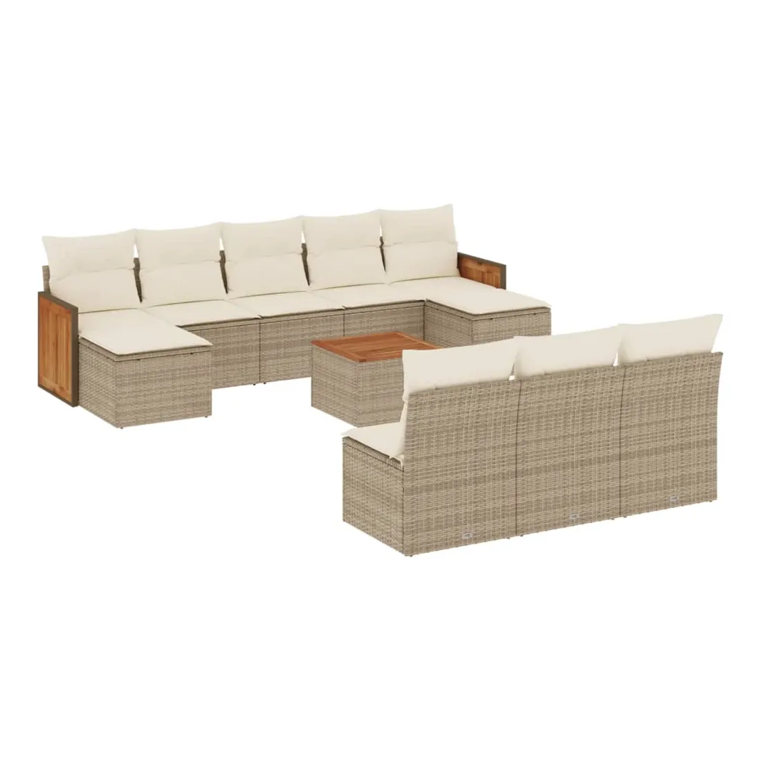 Cet ensemble de canapés de jardin est le complément parfait de votre arrière-cour, terrasse ou patio, offrant un espace confortable et accueillant pour discuter avec la famille et les amis ou simplement se détendre et profiter de l'extérieur. Matériau durable : la résine tressée, également connue sous le nom de poly rotin, est un matériau synthétique solide et nécessitant peu d'entretien qui ressemble au rotin naturel. Il est léger, facile à nettoyer et couramment utilisé pour les meubles d'extérieur en raison de sa durabilité et de ses propriétés de résistance aux intempéries.Expérience d'assise confortable : ce mobilier d'extérieur, doté de coussins épais, offre une expérience d'assise confortable.Dessus stable et facile à nettoyer : cette table de jardin a un dessus en bois d'acacia robuste, durable et facile à nettoyer avec un chiffon humide.Housse amovible et lavable : ces coussins de siège sont dotés de housses amovibles pour un lavage et un entretien faciles.Conception modulaire : cet ensemble de meubles d'extérieur a une conception modulaire, ce qui le rend complètement flexible et facile à déplacer, afin que vous puissiez créer un agencement de meubles d'extérieur personnalisé. Bon à savoir :Pour que vos meubles d'extérieur restent beaux, nous vous recommandons de les protéger avec une housse imperméable.