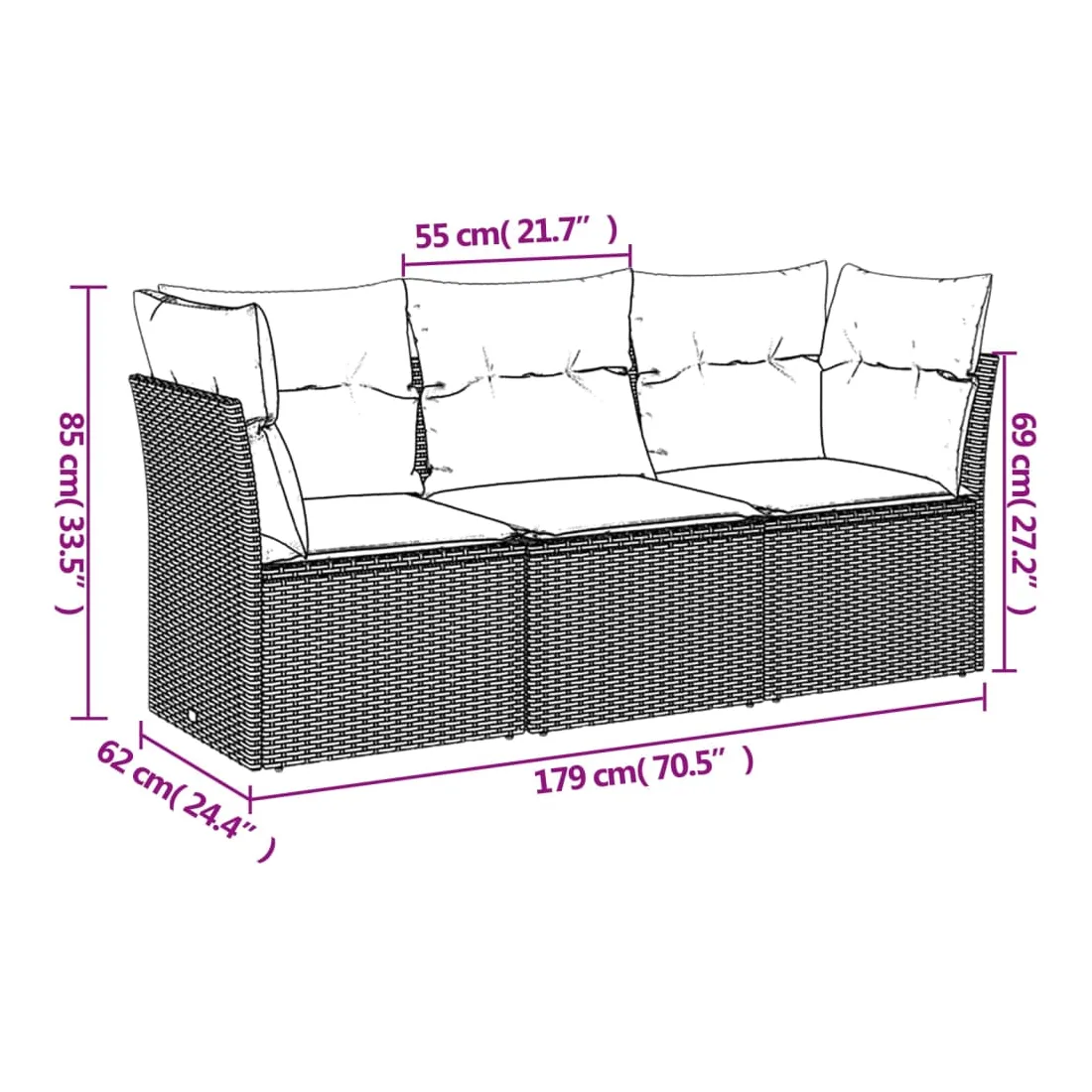 - Dimensions totales du canapé : 179 x 62 x 69 cm (l x P x H)