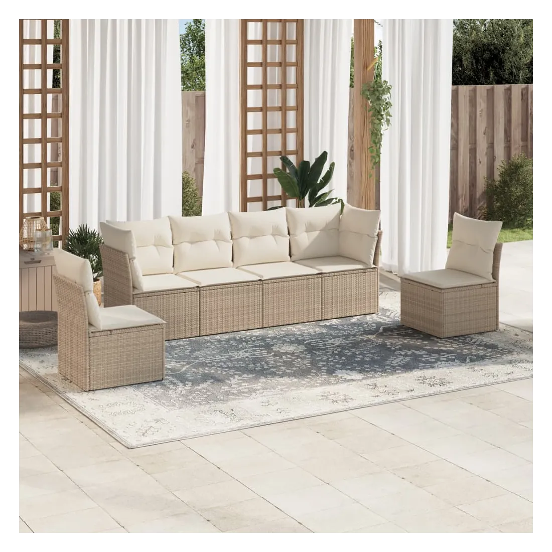 Cet ensemble de canapés de jardin est le complément parfait de votre arrière-cour, terrasse ou patio, offrant un espace confortable et accueillant pour discuter avec la famille et les amis ou simplement se détendre et profiter de l'extérieur. Matériau durable : la résine tressée, également connue sous le nom de poly rotin, est un matériau synthétique solide et nécessitant peu d'entretien qui ressemble au rotin naturel. Il est léger, facile à nettoyer et couramment utilisé pour les meubles d'extérieur en raison de sa durabilité et de ses propriétés de résistance aux intempéries.Fonction de rangement avec sac résistant à l'eau : chaque siège de jardin dispose d'un espace de rangement sous l'assise, complété par un sac résistant à l'eau pour ranger les coussins, les jouets et d'autres objets. Les sacs intérieurs sont dotés d'un couvercle et peuvent être solidement fixés aux sièges à l'aide de bandes auto-agrippantes pour plus de stabilité.Housse amovible et lavable : ces coussins de siège sont dotés de housses amovibles pour un lavage et un entretien faciles.Conception modulaire : cet ensemble de meubles d'extérieur a une conception modulaire, ce qui le rend complètement flexible et facile à déplacer, afin que vous puissiez créer un agencement de meubles d'extérieur personnalisé. Bon à savoir :Pour que vos meubles d'extérieur restent beaux, nous vous recommandons de les protéger avec une housse imperméable.