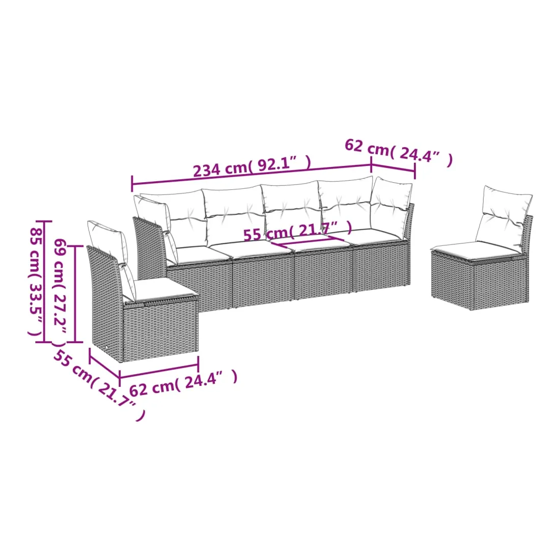 - Dimensions totales du canapé 4 places : 234 x 62 x 69 cm (l x P x H)