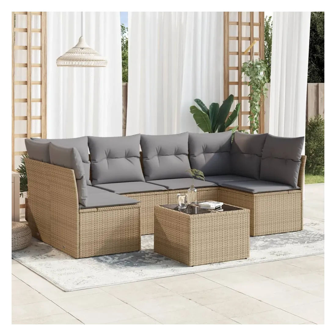 Cet ensemble de canapés de jardin est le complément parfait de votre arrière-cour, terrasse ou patio, offrant un espace confortable et accueillant pour discuter avec la famille et les amis ou simplement se détendre et profiter de l'extérieur. Matériau durable : la résine tressée, également connue sous le nom de poly rotin, est un matériau synthétique solide et nécessitant peu d'entretien qui ressemble au rotin naturel. Il est léger, facile à nettoyer et couramment utilisé pour les meubles d'extérieur en raison de sa durabilité et de ses propriétés de résistance aux intempéries.Fonction de rangement avec sac résistant à l'eau : chaque siège de jardin dispose d'un espace de rangement sous l'assise, complété par un sac résistant à l'eau pour ranger les coussins, les jouets et d'autres objets. Les sacs intérieurs sont dotés d'un couvercle et peuvent être solidement fixés aux sièges à l'aide de bandes auto-agrippantes pour plus de stabilité.Dessus en verre : le dessus de la table d'extérieur est fabriqué en verre trempé solide et durable, ce qui le rend facile à nettoyer avec un chiffon humide et ajoute une touche d'élégance à votre espace extérieur.Housse amovible et lavable : ces coussins de siège sont dotés de housses amovibles pour un lavage et un entretien faciles.Conception modulaire : cet ensemble de meubles d'extérieur a une conception modulaire, ce qui le rend complètement flexible et facile à déplacer, afin que vous puissiez créer un agencement de meubles d'extérieur personnalisé. Bon à savoir :Pour que vos meubles d'extérieur restent beaux, nous vous recommandons de les protéger avec une housse imperméable.