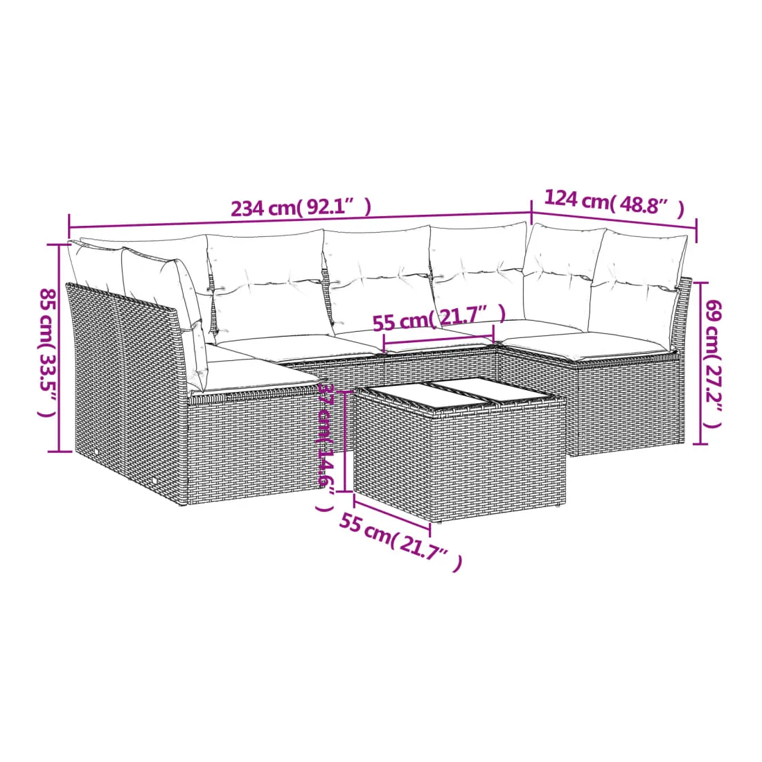 - Dimensions totales du canapé : 234 x 124 x 69 cm (l x P x H)