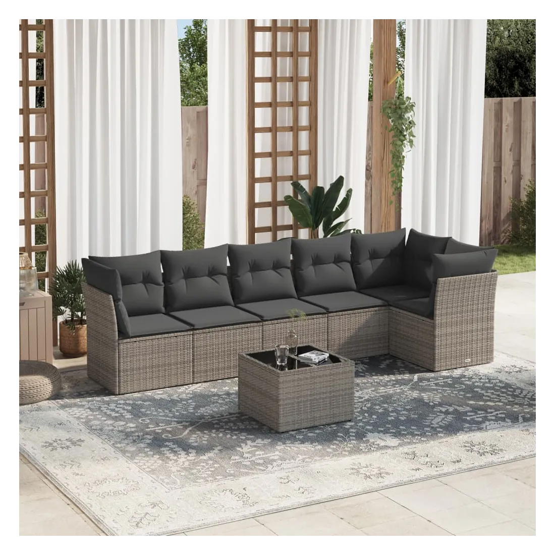 Cet ensemble de canapés de jardin est le complément parfait de votre arrière-cour, terrasse ou patio, offrant un espace confortable et accueillant pour discuter avec la famille et les amis ou simplement se détendre et profiter de l'extérieur. Matériau durable : la résine tressée, également connue sous le nom de poly rotin, est un matériau synthétique solide et nécessitant peu d'entretien qui ressemble au rotin naturel. Il est léger, facile à nettoyer et couramment utilisé pour les meubles d'extérieur en raison de sa durabilité et de ses propriétés de résistance aux intempéries.Fonction de rangement avec sac résistant à l'eau : chaque siège de jardin dispose d'un espace de rangement sous l'assise, complété par un sac résistant à l'eau pour ranger les coussins, les jouets et d'autres objets. Les sacs intérieurs sont dotés d'un couvercle et peuvent être solidement fixés aux sièges à l'aide de bandes auto-agrippantes pour plus de stabilité.Dessus en verre : le dessus de la table d'extérieur est fabriqué en verre trempé solide et durable, ce qui le rend facile à nettoyer avec un chiffon humide et ajoute une touche d'élégance à votre espace extérieur.Housse amovible et lavable : ces coussins de siège sont dotés de housses amovibles pour un lavage et un entretien faciles.Conception modulaire : cet ensemble de meubles d'extérieur a une conception modulaire, ce qui le rend complètement flexible et facile à déplacer, afin que vous puissiez créer un agencement de meubles d'extérieur personnalisé. Bon à savoir :Pour que vos meubles d'extérieur restent beaux, nous vous recommandons de les protéger avec une housse imperméable.