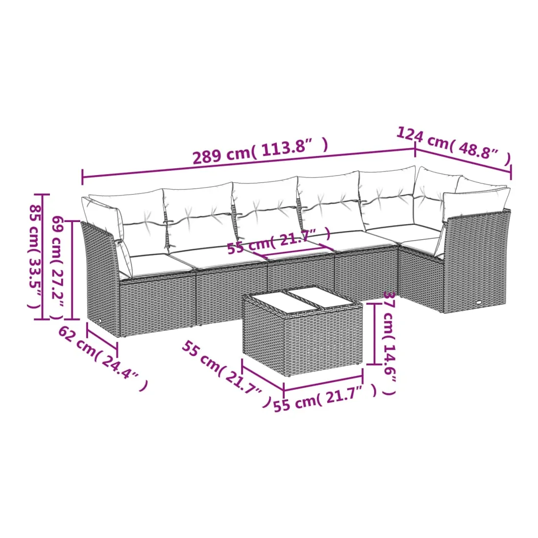 - Dimensions totales du canapé : 289 x 124 x 69 cm (l x P x H)