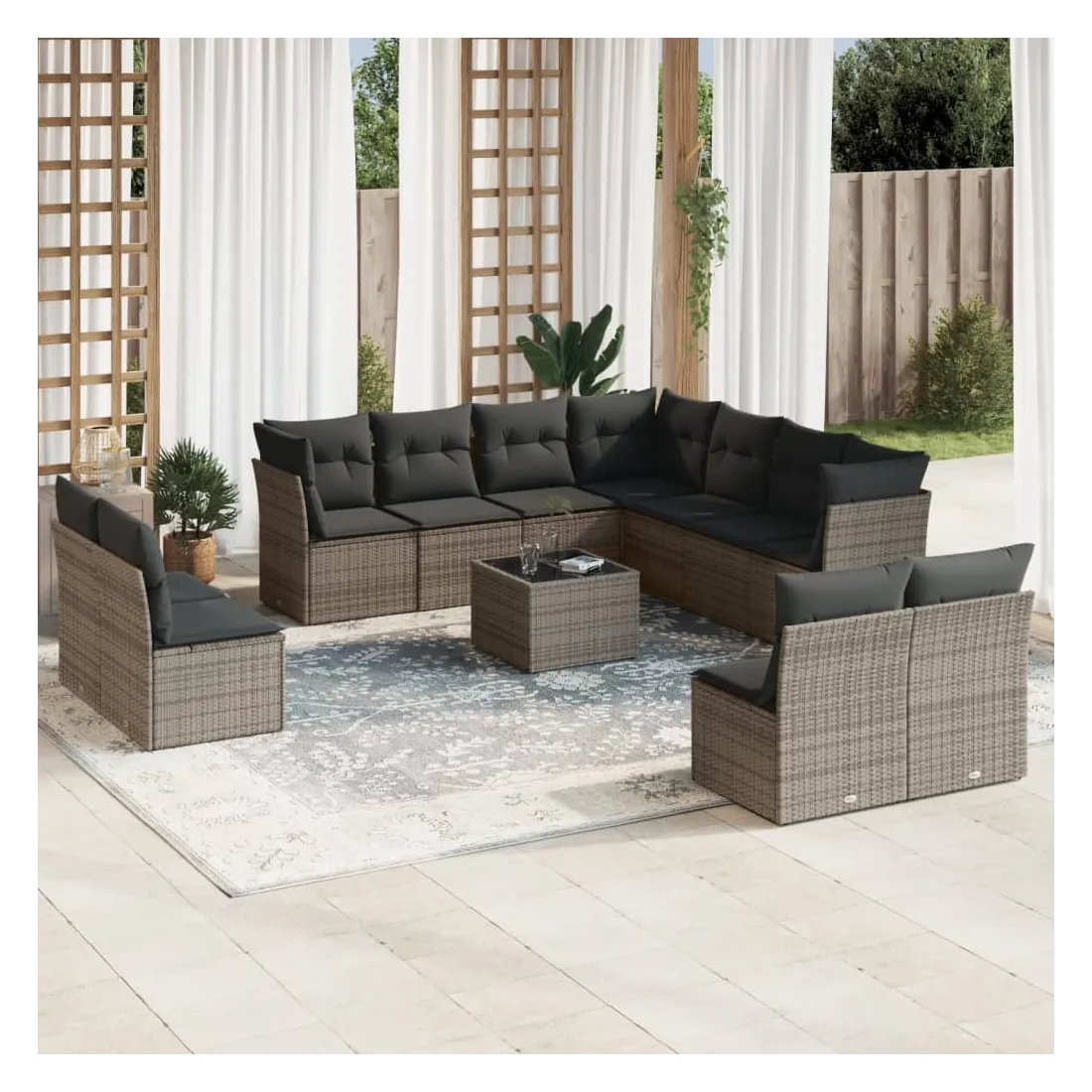 Cet ensemble de canapés de jardin est le complément parfait de votre arrière-cour, terrasse ou patio, offrant un espace confortable et accueillant pour discuter avec la famille et les amis ou simplement se détendre et profiter de l'extérieur. Matériau durable : la résine tressée, également connue sous le nom de poly rotin, est un matériau synthétique solide et nécessitant peu d'entretien qui ressemble au rotin naturel. Il est léger, facile à nettoyer et couramment utilisé pour les meubles d'extérieur en raison de sa durabilité et de ses propriétés de résistance aux intempéries.Fonction de rangement avec sac résistant à l'eau : chaque siège de jardin dispose d'un espace de rangement sous l'assise, complété par un sac résistant à l'eau pour ranger les coussins, les jouets et d'autres objets. Les sacs intérieurs sont dotés d'un couvercle et peuvent être solidement fixés aux sièges à l'aide de bandes auto-agrippantes pour plus de stabilité.Dessus en verre : le dessus de la table d'extérieur est fabriqué en verre trempé solide et durable, ce qui le rend facile à nettoyer avec un chiffon humide et ajoute une touche d'élégance à votre espace extérieur.Housse amovible et lavable : ces coussins de siège sont dotés de housses amovibles pour un lavage et un entretien faciles.Conception modulaire : cet ensemble de meubles d'extérieur a une conception modulaire, ce qui le rend complètement flexible et facile à déplacer, afin que vous puissiez créer un agencement de meubles d'extérieur personnalisé. Bon à savoir :Pour que vos meubles d'extérieur restent beaux, nous vous recommandons de les protéger avec une housse imperméable.
