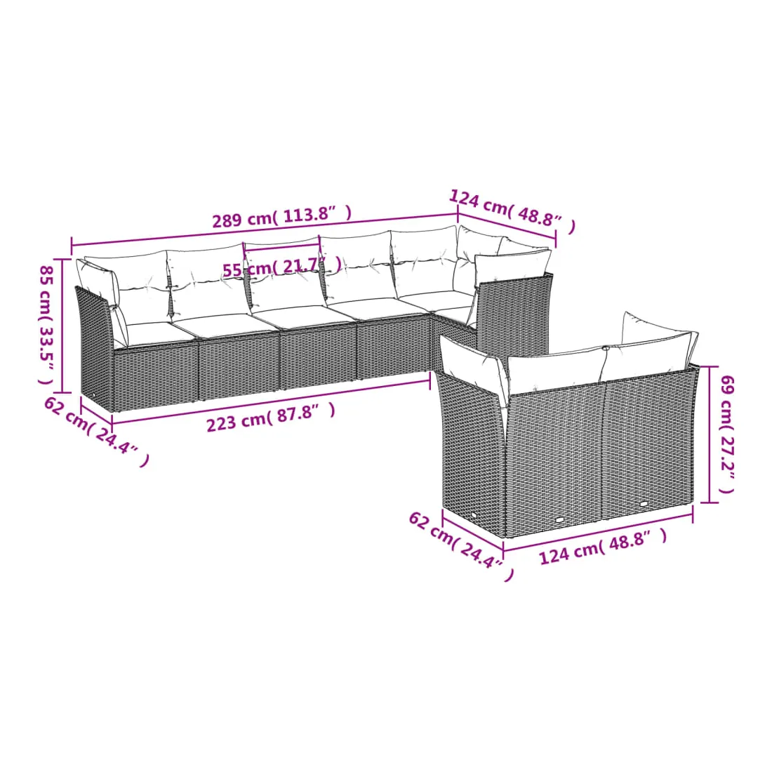 - Dimensions totales du canapé 6 places : 289 x 124 x 69 cm (l x P x H)