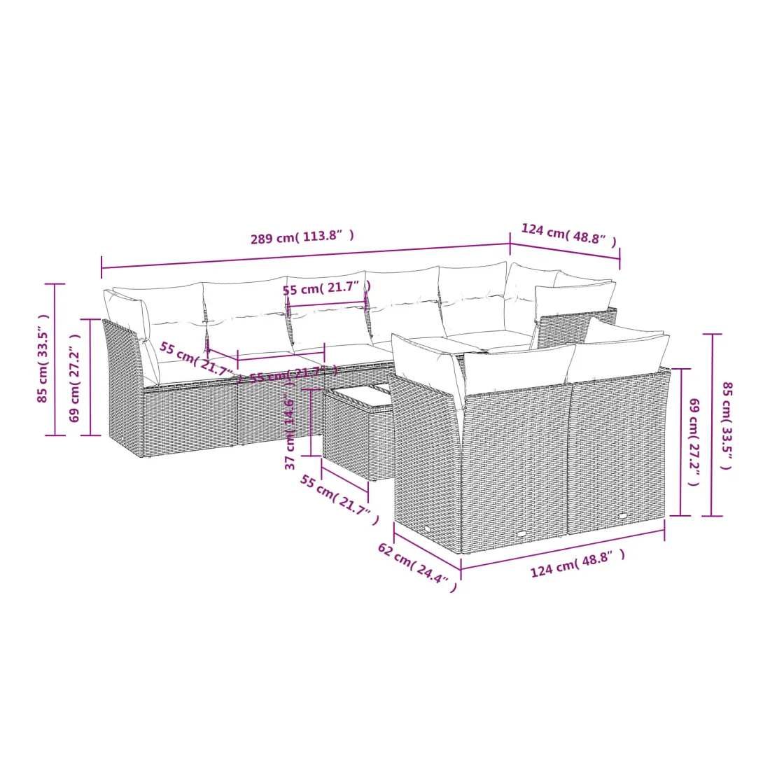- Dimensions totales du canapé 6 places : 289 x 124 x 69 cm (l x P x H)