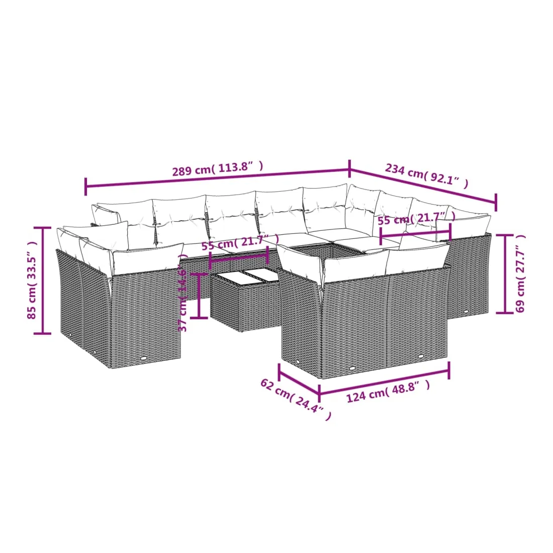 Cet ensemble de canapés de jardin est le complément parfait de votre arrière-cour, terrasse ou patio, offrant un espace confortable et accueillant pour discuter avec la famille et les amis ou simplement se détendre et profiter de l'extérieur. Matériau durable : la résine tressée, également connue sous le nom de poly rotin, est un matériau synthétique solide et nécessitant peu d'entretien qui ressemble au rotin naturel. Il est léger, facile à nettoyer et couramment utilisé pour les meubles d'extérieur en raison de sa durabilité et de ses propriétés de résistance aux intempéries.Fonction de rangement avec sac résistant à l'eau : chaque siège de jardin dispose d'un espace de rangement sous l'assise, complété par un sac résistant à l'eau pour ranger les coussins, les jouets et d'autres objets. Les sacs intérieurs sont dotés d'un couvercle et peuvent être solidement fixés aux sièges à l'aide de bandes auto-agrippantes pour plus de stabilité.Dessus en verre : le dessus de la table d'extérieur est fabriqué en verre trempé solide et durable, ce qui le rend facile à nettoyer avec un chiffon humide et ajoute une touche d'élégance à votre espace extérieur.Housse amovible et lavable : ces coussins de siège sont dotés de housses amovibles pour un lavage et un entretien faciles.Conception modulaire : cet ensemble de meubles d'extérieur a une conception modulaire, ce qui le rend complètement flexible et facile à déplacer, afin que vous puissiez créer un agencement de meubles d'extérieur personnalisé. Bon à savoir :Pour que vos meubles d'extérieur restent beaux, nous vous recommandons de les protéger avec une housse imperméable.
