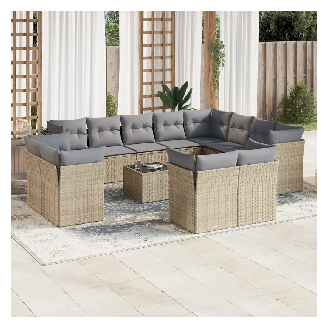 Cet ensemble de canapés de jardin est le complément parfait de votre arrière-cour, terrasse ou patio, offrant un espace confortable et accueillant pour discuter avec la famille et les amis ou simplement se détendre et profiter de l'extérieur. Matériau durable : la résine tressée, également connue sous le nom de poly rotin, est un matériau synthétique solide et nécessitant peu d'entretien qui ressemble au rotin naturel. Il est léger, facile à nettoyer et couramment utilisé pour les meubles d'extérieur en raison de sa durabilité et de ses propriétés de résistance aux intempéries.Fonction de rangement avec sac résistant à l'eau : chaque siège de jardin dispose d'un espace de rangement sous l'assise, complété par un sac résistant à l'eau pour ranger les coussins, les jouets et d'autres objets. Les sacs intérieurs sont dotés d'un couvercle et peuvent être solidement fixés aux sièges à l'aide de bandes auto-agrippantes pour plus de stabilité.Dessus en verre : le dessus de la table d'extérieur est fabriqué en verre trempé solide et durable, ce qui le rend facile à nettoyer avec un chiffon humide et ajoute une touche d'élégance à votre espace extérieur.Housse amovible et lavable : ces coussins de siège sont dotés de housses amovibles pour un lavage et un entretien faciles.Conception modulaire : cet ensemble de meubles d'extérieur a une conception modulaire, ce qui le rend complètement flexible et facile à déplacer, afin que vous puissiez créer un agencement de meubles d'extérieur personnalisé. Bon à savoir :Pour que vos meubles d'extérieur restent beaux, nous vous recommandons de les protéger avec une housse imperméable.