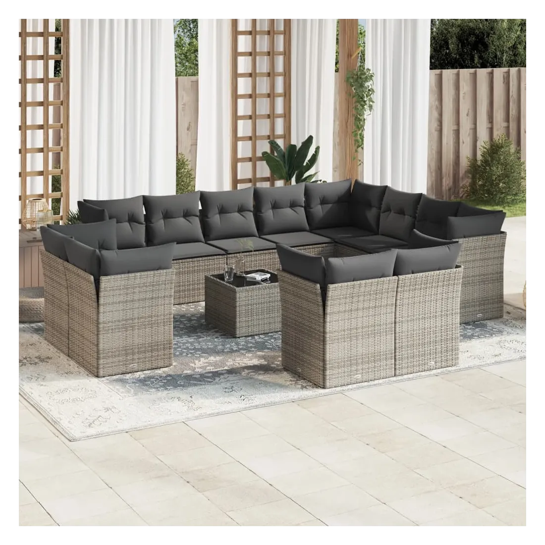Cet ensemble de canapés de jardin est le complément parfait de votre arrière-cour, terrasse ou patio, offrant un espace confortable et accueillant pour discuter avec la famille et les amis ou simplement se détendre et profiter de l'extérieur. Matériau durable : la résine tressée, également connue sous le nom de poly rotin, est un matériau synthétique solide et nécessitant peu d'entretien qui ressemble au rotin naturel. Il est léger, facile à nettoyer et couramment utilisé pour les meubles d'extérieur en raison de sa durabilité et de ses propriétés de résistance aux intempéries.Fonction de rangement avec sac résistant à l'eau : chaque siège de jardin dispose d'un espace de rangement sous l'assise, complété par un sac résistant à l'eau pour ranger les coussins, les jouets et d'autres objets. Les sacs intérieurs sont dotés d'un couvercle et peuvent être solidement fixés aux sièges à l'aide de bandes auto-agrippantes pour plus de stabilité.Dessus en verre : le dessus de la table d'extérieur est fabriqué en verre trempé solide et durable, ce qui le rend facile à nettoyer avec un chiffon humide et ajoute une touche d'élégance à votre espace extérieur.Housse amovible et lavable : ces coussins de siège sont dotés de housses amovibles pour un lavage et un entretien faciles.Conception modulaire : cet ensemble de meubles d'extérieur a une conception modulaire, ce qui le rend complètement flexible et facile à déplacer, afin que vous puissiez créer un agencement de meubles d'extérieur personnalisé. Bon à savoir :Pour que vos meubles d'extérieur restent beaux, nous vous recommandons de les protéger avec une housse imperméable.
