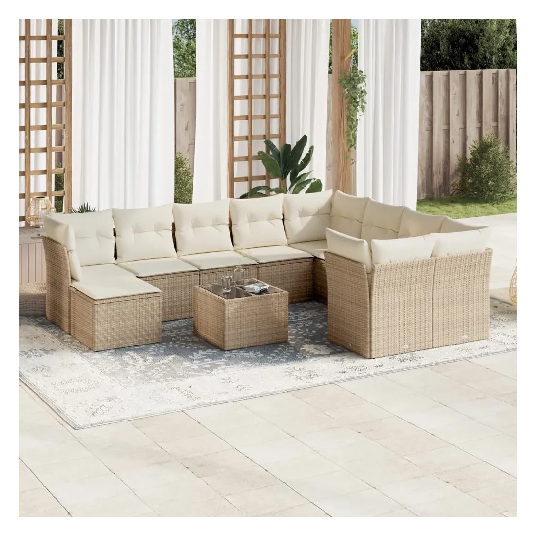 Cet ensemble de canapés de jardin est le complément parfait de votre arrière-cour, terrasse ou patio, offrant un espace confortable et accueillant pour discuter avec la famille et les amis ou simplement se détendre et profiter de l'extérieur. Matériau durable : la résine tressée, également connue sous le nom de poly rotin, est un matériau synthétique solide et nécessitant peu d'entretien qui ressemble au rotin naturel. Il est léger, facile à nettoyer et couramment utilisé pour les meubles d'extérieur en raison de sa durabilité et de ses propriétés de résistance aux intempéries.Fonction de rangement avec sac résistant à l'eau : chaque siège de jardin dispose d'un espace de rangement sous l'assise, complété par un sac résistant à l'eau pour ranger les coussins, les jouets et d'autres objets. Les sacs intérieurs sont dotés d'un couvercle et peuvent être solidement fixés aux sièges à l'aide de bandes auto-agrippantes pour plus de stabilité.Dessus en verre : le dessus de la table d'extérieur est fabriqué en verre trempé solide et durable, ce qui le rend facile à nettoyer avec un chiffon humide et ajoute une touche d'élégance à votre espace extérieur.Housse amovible et lavable : ces coussins de siège sont dotés de housses amovibles pour un lavage et un entretien faciles.Conception modulaire : cet ensemble de meubles d'extérieur a une conception modulaire, ce qui le rend complètement flexible et facile à déplacer, afin que vous puissiez créer un agencement de meubles d'extérieur personnalisé. Bon à savoir :Pour que vos meubles d'extérieur restent beaux, nous vous recommandons de les protéger avec une housse imperméable.