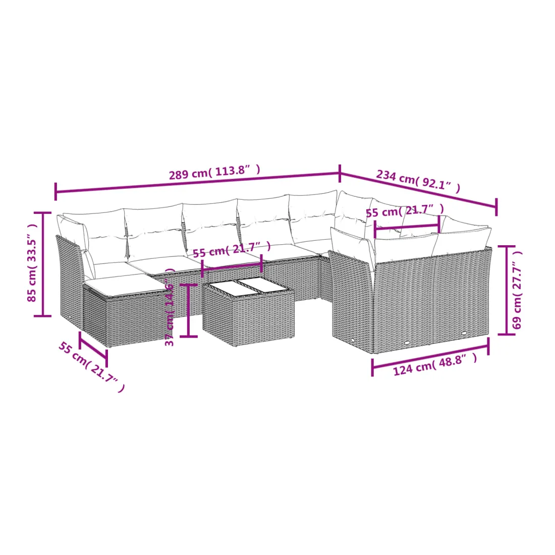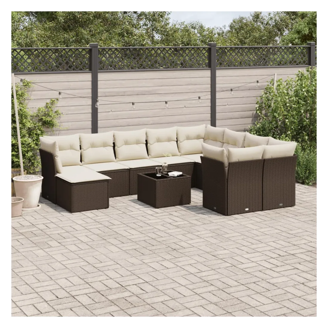 Cet ensemble de canapés de jardin est le complément parfait de votre arrière-cour, terrasse ou patio, offrant un espace confortable et accueillant pour discuter avec la famille et les amis ou simplement se détendre et profiter de l'extérieur. Matériau durable : la résine tressée, également connue sous le nom de poly rotin, est un matériau synthétique solide et nécessitant peu d'entretien qui ressemble au rotin naturel. Il est léger, facile à nettoyer et couramment utilisé pour les meubles d'extérieur en raison de sa durabilité et de ses propriétés de résistance aux intempéries.Fonction de rangement avec sac résistant à l'eau : chaque siège de jardin dispose d'un espace de rangement sous l'assise, complété par un sac résistant à l'eau pour ranger les coussins, les jouets et d'autres objets. Les sacs intérieurs sont dotés d'un couvercle et peuvent être solidement fixés aux sièges à l'aide de bandes auto-agrippantes pour plus de stabilité.Dessus en verre : le dessus de la table d'extérieur est fabriqué en verre trempé solide et durable, ce qui le rend facile à nettoyer avec un chiffon humide et ajoute une touche d'élégance à votre espace extérieur.Housse amovible et lavable : ces coussins de siège sont dotés de housses amovibles pour un lavage et un entretien faciles.Conception modulaire : cet ensemble de meubles d'extérieur a une conception modulaire, ce qui le rend complètement flexible et facile à déplacer, afin que vous puissiez créer un agencement de meubles d'extérieur personnalisé. Bon à savoir :Pour que vos meubles d'extérieur restent beaux, nous vous recommandons de les protéger avec une housse imperméable.
