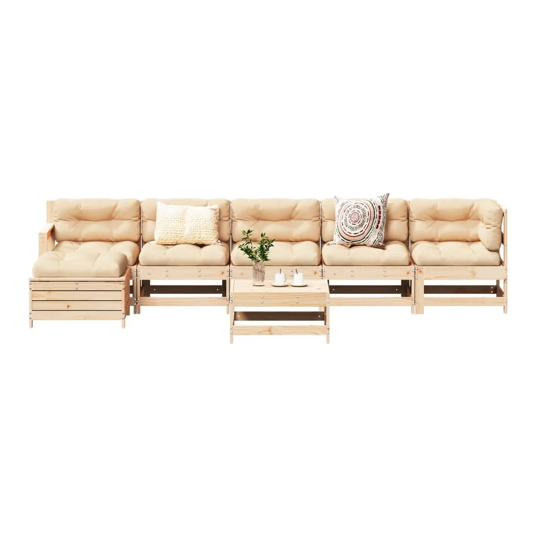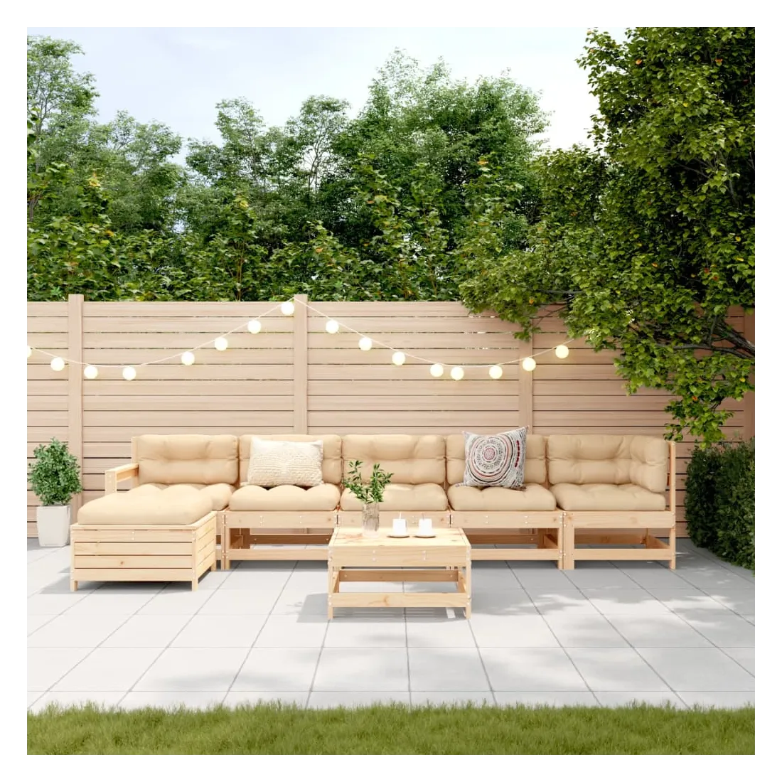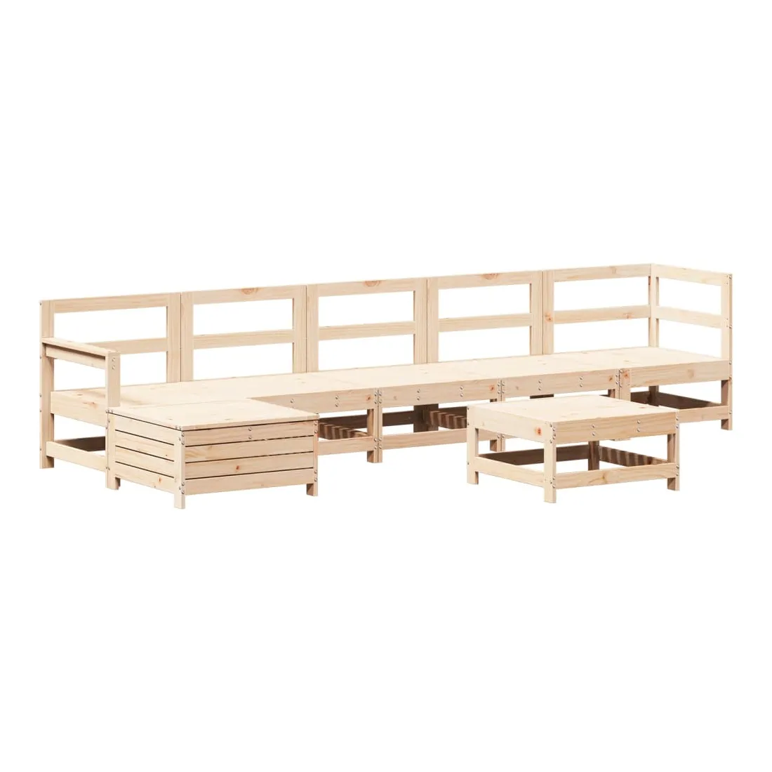 Cet ensemble de salon de jardin en bois avec un design à lattes sera un excellent complément à votre jardin, patio ou terrasse pour profiter d'un moment agréable avec votre famille ou vos amis. Bois de pin massif : le bois de pin massif est un matériau naturel magnifique. Le bois de pin a un grain droit et les nœuds donnent au matériau son aspect caractéristique et rustique.Cadre robuste et stable : les cadres en bois rendent l'ensemble de salon robuste et stable pour une utilisation quotidienne à l'extérieur.Expérience d'assise confortable : les dossiers et les accoudoirs ajoutent un confort d'assise supplémentaire à l'ensemble de mobilier de jardin. Utilisation polyvalente : le pouf d'extérieur avec couvercle peut non seulement être utilisé pour s'asseoir ou se détendre, mais il peut également être utilisé comme table basse pour contenir vos boissons, votre nourriture et le meuble de jardin dispose d'un espace de rangement sous le siège. Conception modulaire : cet ensemble de meubles d'extérieur a une conception modulaire, ce qui le rend complètement flexible et facile à déplacer, afin que vous puissiez créer un agencement de meubles d'extérieur personnalisé. Bon à savoir :Pour que vos meubles d'extérieur restent beaux, nous vous recommandons de les protéger avec une housse imperméable.