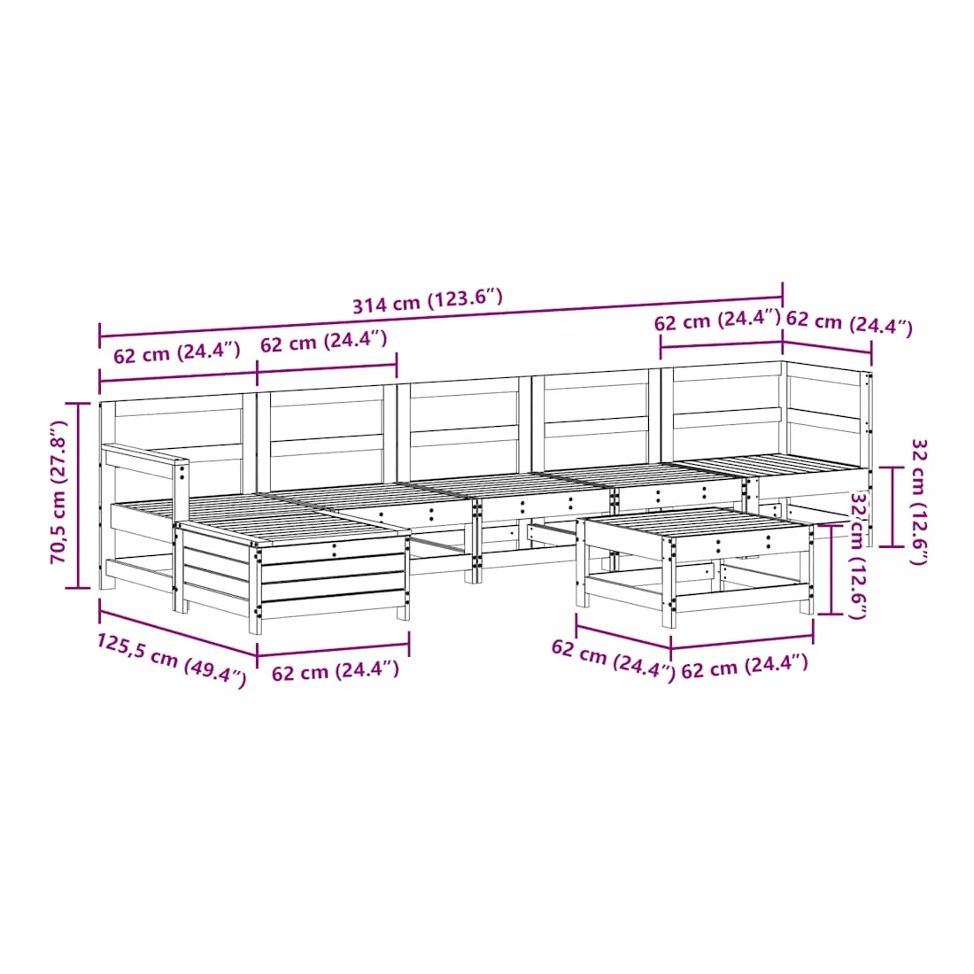 - Dimensions du repose-pied de jardin : 62 x 62/63,5 x 32 cm (l x P x H)
