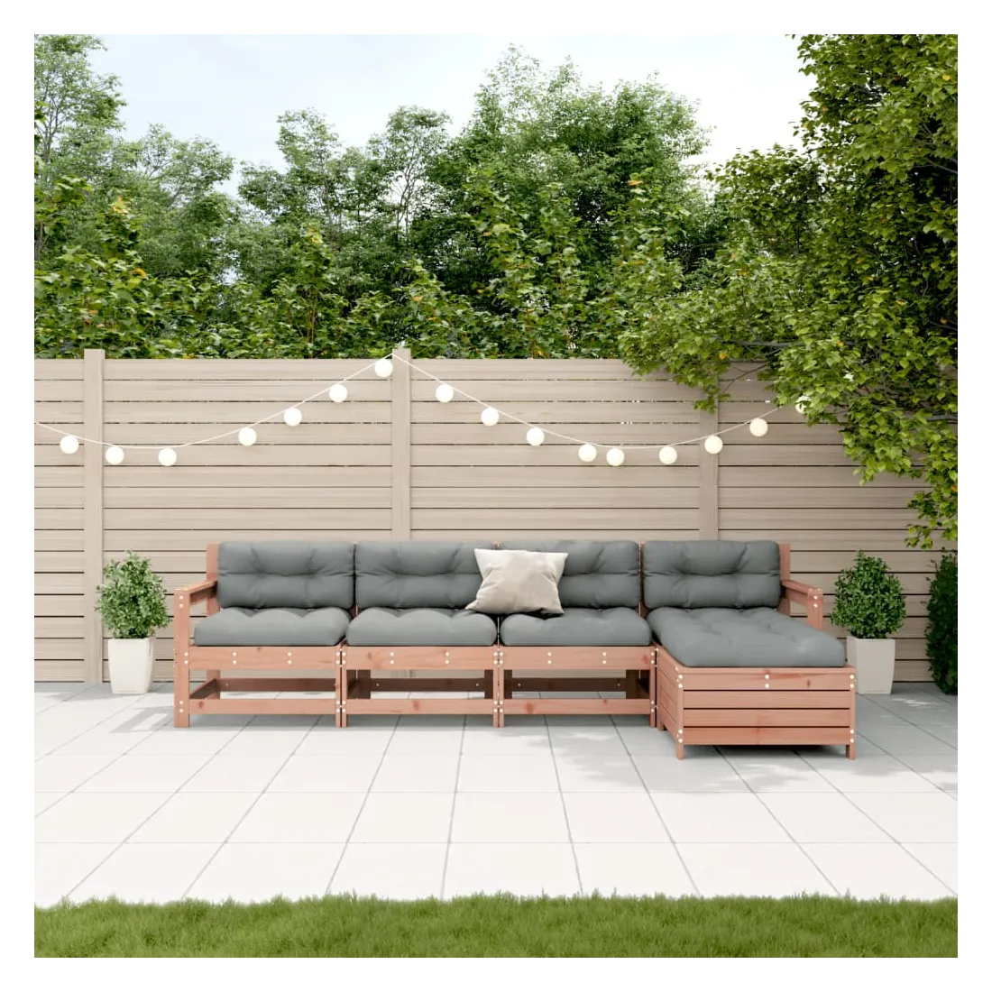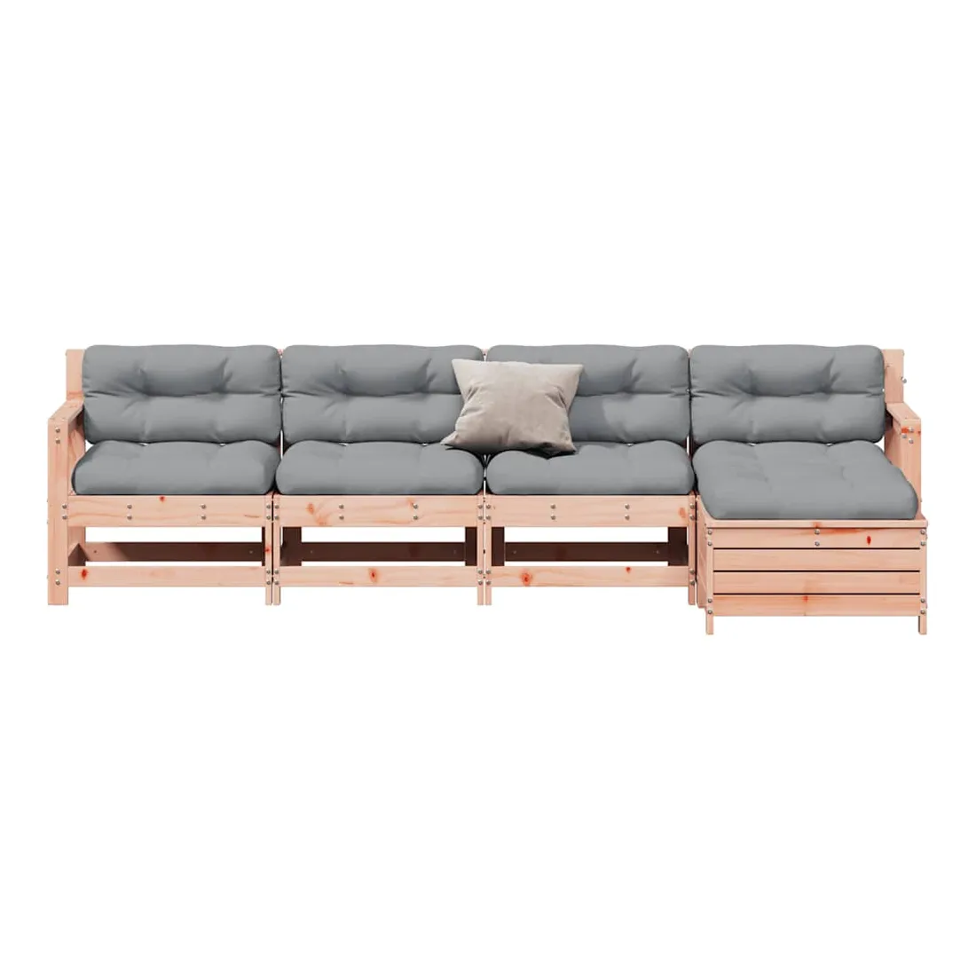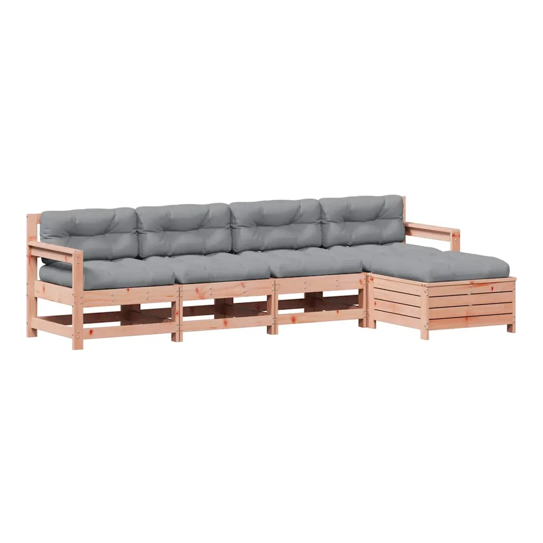 Cet ensemble de salon de jardin en bois avec un design à lattes sera un excellent complément à votre jardin, patio ou terrasse pour profiter d'un moment agréable avec votre famille ou vos amis. Bois de douglas massif : le bois de douglas massif est un bois très durable qui fonctionne bien pour l'extérieur. Le bois de douglas est également suffisamment solide pour être travaillé avec un minimum de soin, même sous l'influence des intempéries.Design à lattes : le design à lattes de la chaise de jardin en bois empêche l'accumulation de l'eau, ce qui permet de garder le siège au sec et d'éviter un pourrissement inutile.Expérience d'assise confortable : le dossier et l'accoudoir ajoutent un confort d'assise supplémentaire à l'ensemble de meubles de jardin. De plus, le coussin bien rembourré vous permet de vous asseoir confortablement.Utilisation polyvalente : le pouf d'extérieur avec couvercle peut non seulement être utilisé pour s'asseoir ou se détendre, mais il peut également être utilisé comme table basse pour contenir vos boissons, votre nourriture et le meuble de jardin dispose d'un espace de rangement sous le siège. Conception modulaire : cet ensemble de meubles d'extérieur a une conception modulaire, ce qui le rend complètement flexible et facile à déplacer, afin que vous puissiez créer un agencement de meubles d'extérieur personnalisé. Bon à savoir :Pour que vos meubles d'extérieur restent beaux, nous vous recommandons de les protéger avec une housse imperméable.