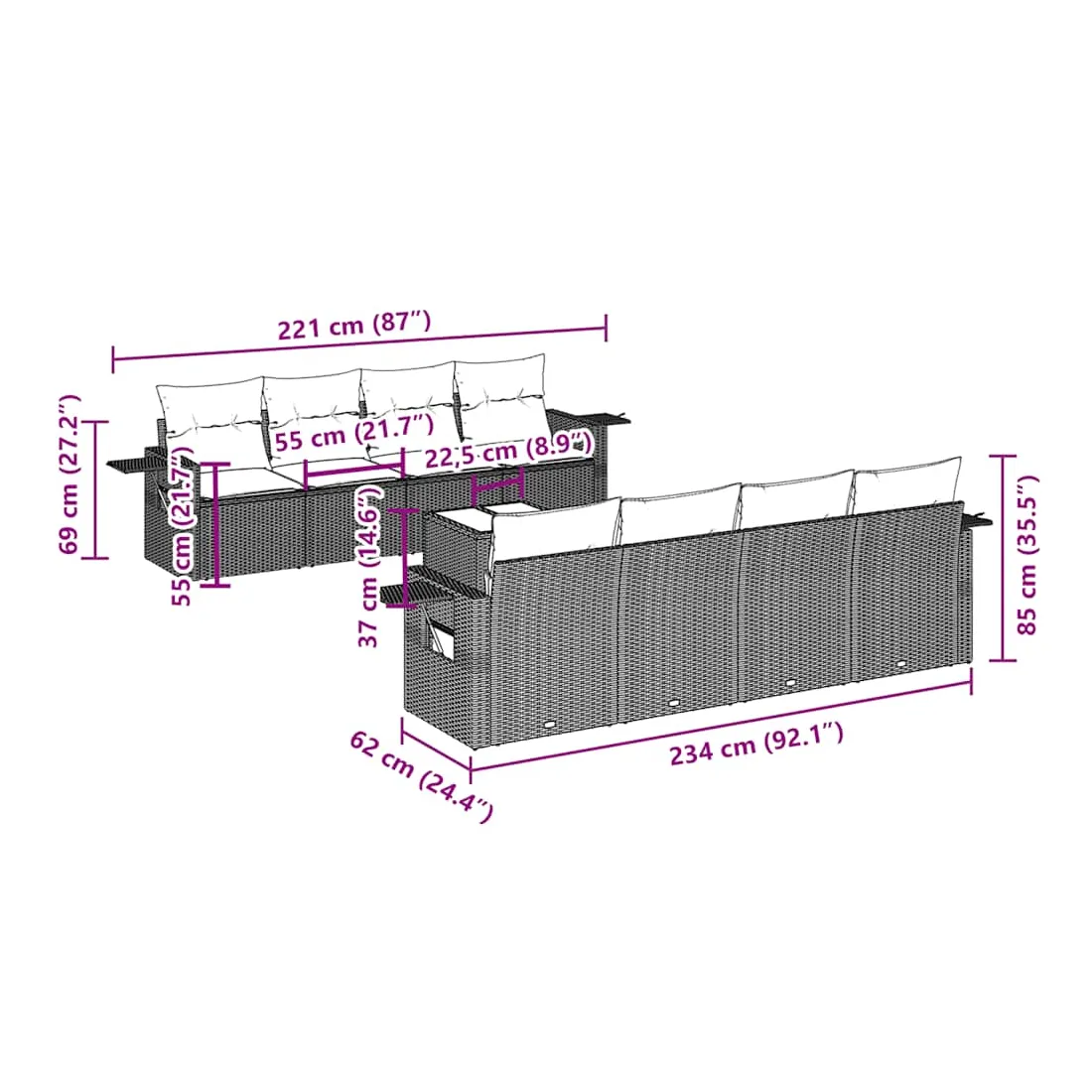 Cet ensemble de canapés de jardin est le complément parfait de votre arrière-cour, terrasse ou patio, offrant un espace confortable et accueillant pour discuter avec la famille et les amis ou simplement se détendre et profiter de l'extérieur. Matériau durable : la résine tressée, également connue sous le nom de poly rotin, est un matériau synthétique solide et nécessitant peu d'entretien qui ressemble au rotin naturel. Il est léger, facile à nettoyer et couramment utilisé pour les meubles d'extérieur en raison de sa durabilité et de ses propriétés de résistance aux intempéries.Fonction de rangement avec sac résistant à l'eau : le mobilier de jardin dispose d'un espace de rangement sous l'assise, complété par un sac résistant à l'eau pour ranger coussins, jouets et autres objets. Le sac intérieur peut être solidement fixé au mobilier d'extérieur grâce à des attaches auto-agrippantes pour plus de stabilité.Table d'appoint pratique : ce mobilier d'extérieur comprend une table d'appoint pliable avec un ressort à gaz sur les accoudoirs, offrant un endroit pratique pour garder vos essentiels à portée de main.Housse amovible et lavable : ces coussins de siège sont dotés de housses amovibles pour un lavage et un entretien faciles.Conception modulaire : cet ensemble de meubles d'extérieur a une conception modulaire, ce qui le rend complètement flexible et facile à déplacer, afin que vous puissiez créer un agencement de meubles d'extérieur personnalisé. Bon à savoir :Pour que vos meubles d'extérieur restent beaux, nous vous recommandons de les protéger avec une housse imperméable.
