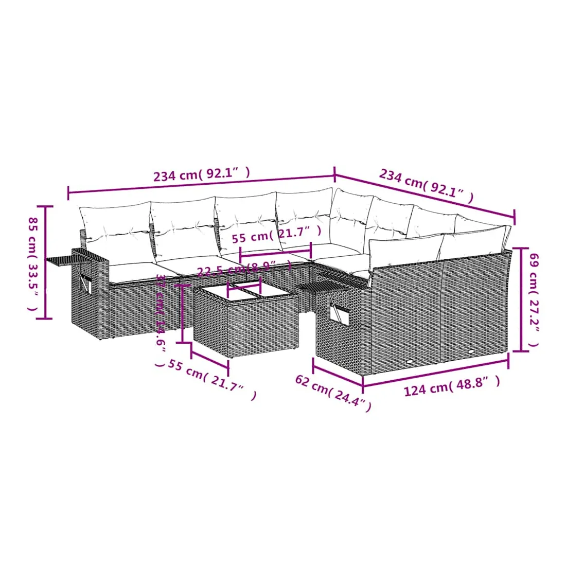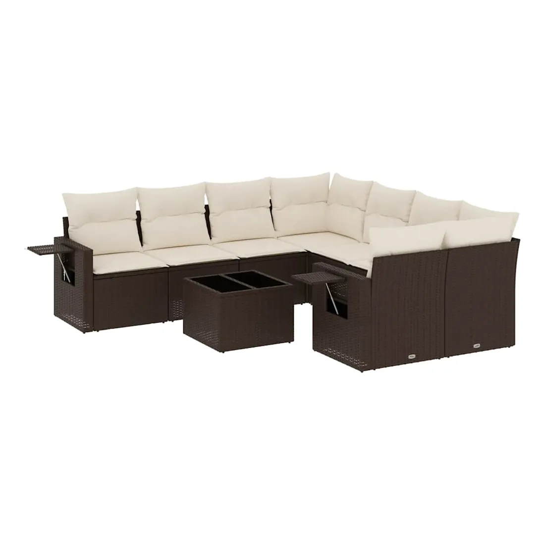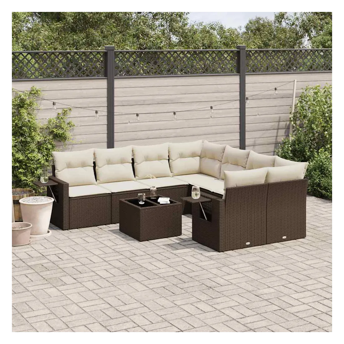 Cet ensemble de canapés de jardin est le complément parfait de votre arrière-cour, terrasse ou patio, offrant un espace confortable et accueillant pour discuter avec la famille et les amis ou simplement se détendre et profiter de l'extérieur. Matériau durable : la résine tressée, également connue sous le nom de poly rotin, est un matériau synthétique solide et nécessitant peu d'entretien qui ressemble au rotin naturel. Il est léger, facile à nettoyer et couramment utilisé pour les meubles d'extérieur en raison de sa durabilité et de ses propriétés de résistance aux intempéries.Fonction de rangement avec sac résistant à l'eau : le mobilier de jardin dispose d'un espace de rangement sous l'assise, complété par un sac résistant à l'eau pour ranger coussins, jouets et autres objets. Le sac intérieur peut être solidement fixé au mobilier d'extérieur grâce à des attaches auto-agrippantes pour plus de stabilité.Table d'appoint pratique : ce mobilier d'extérieur comprend une table d'appoint pliable avec un ressort à gaz sur les accoudoirs, offrant un endroit pratique pour garder vos essentiels à portée de main.Housse amovible et lavable : ces coussins de siège sont dotés de housses amovibles pour un lavage et un entretien faciles.Conception modulaire : cet ensemble de meubles d'extérieur a une conception modulaire, ce qui le rend complètement flexible et facile à déplacer, afin que vous puissiez créer un agencement de meubles d'extérieur personnalisé. Bon à savoir :Pour que vos meubles d'extérieur restent beaux, nous vous recommandons de les protéger avec une housse imperméable.