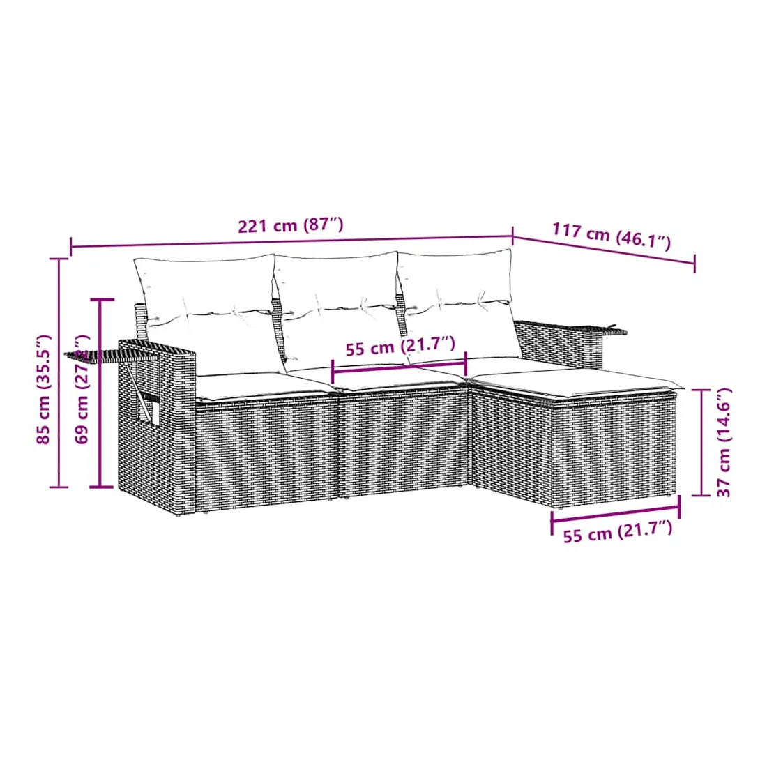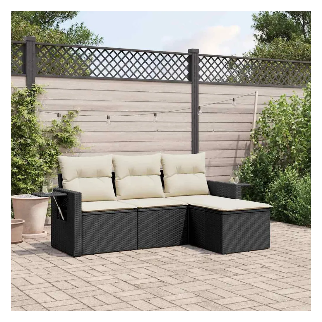 Cet ensemble de canapés de jardin est le complément parfait de votre arrière-cour, terrasse ou patio, offrant un espace confortable et accueillant pour discuter avec la famille et les amis ou simplement se détendre et profiter de l'extérieur. Matériau durable : la résine tressée, également connue sous le nom de poly rotin, est un matériau synthétique solide et nécessitant peu d'entretien qui ressemble au rotin naturel. Il est léger, facile à nettoyer et couramment utilisé pour les meubles d'extérieur en raison de sa durabilité et de ses propriétés de résistance aux intempéries.Fonction de rangement avec sac résistant à l'eau : le mobilier de jardin dispose d'un espace de rangement sous l'assise, complété par un sac résistant à l'eau pour ranger coussins, jouets et autres objets. Le sac intérieur peut être solidement fixé au mobilier d'extérieur grâce à des attaches auto-agrippantes pour plus de stabilité.Table d'appoint pratique : ce mobilier d'extérieur comprend une table d'appoint pliable avec un ressort à gaz sur les accoudoirs, offrant un endroit pratique pour garder vos essentiels à portée de main.Housse amovible et lavable : ces coussins de siège sont dotés de housses amovibles pour un lavage et un entretien faciles.Conception modulaire : cet ensemble de meubles d'extérieur a une conception modulaire, ce qui le rend complètement flexible et facile à déplacer, afin que vous puissiez créer un agencement de meubles d'extérieur personnalisé. Bon à savoir :Pour que vos meubles d'extérieur restent beaux, nous vous recommandons de les protéger avec une housse imperméable.