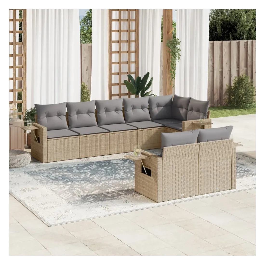 Cet ensemble de canapés de jardin est le complément parfait de votre arrière-cour, terrasse ou patio, offrant un espace confortable et accueillant pour discuter avec la famille et les amis ou simplement se détendre et profiter de l'extérieur. Matériau durable : la résine tressée, également connue sous le nom de poly rotin, est un matériau synthétique solide et nécessitant peu d'entretien qui ressemble au rotin naturel. Il est léger, facile à nettoyer et couramment utilisé pour les meubles d'extérieur en raison de sa durabilité et de ses propriétés de résistance aux intempéries.Fonction de rangement avec sac résistant à l'eau : le mobilier de jardin dispose d'un espace de rangement sous l'assise, complété par un sac résistant à l'eau pour ranger coussins, jouets et autres objets. Le sac intérieur peut être solidement fixé au mobilier d'extérieur grâce à des attaches auto-agrippantes pour plus de stabilité.Table d'appoint pratique : ce mobilier d'extérieur comprend une table d'appoint pliable avec un ressort à gaz sur les accoudoirs, offrant un endroit pratique pour garder vos essentiels à portée de main.Housse amovible et lavable : ces coussins de siège sont dotés de housses amovibles pour un lavage et un entretien faciles.Conception modulaire : cet ensemble de meubles d'extérieur a une conception modulaire, ce qui le rend complètement flexible et facile à déplacer, afin que vous puissiez créer un agencement de meubles d'extérieur personnalisé. Bon à savoir :Pour que vos meubles d'extérieur restent beaux, nous vous recommandons de les protéger avec une housse imperméable.