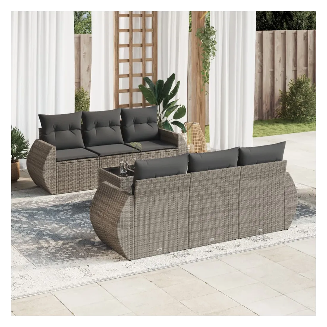 Cet ensemble de canapés de jardin est le complément parfait de votre arrière-cour, terrasse ou patio, offrant un espace confortable et accueillant pour discuter avec la famille et les amis ou simplement se détendre et profiter de l'extérieur. Matériau durable : la résine tressée, également connue sous le nom de poly rotin, est un matériau synthétique solide et nécessitant peu d'entretien qui ressemble au rotin naturel. Il est léger, facile à nettoyer et couramment utilisé pour les meubles d'extérieur en raison de sa durabilité et de ses propriétés de résistance aux intempéries.Fonction de rangement avec sac résistant à l'eau : chaque siège de jardin dispose d'un espace de rangement sous l'assise, complété par un sac résistant à l'eau pour ranger les coussins, les jouets et d'autres objets. Les sacs intérieurs sont dotés d'un couvercle et peuvent être solidement fixés aux sièges à l'aide de bandes auto-agrippantes pour plus de stabilité.Dessus en verre : le dessus de la table d'extérieur est fabriqué en verre trempé solide et durable, ce qui le rend facile à nettoyer avec un chiffon humide et ajoute une touche d'élégance à votre espace extérieur.Housse amovible et lavable : ces coussins de siège sont dotés de housses amovibles pour un lavage et un entretien faciles.Conception modulaire : cet ensemble de meubles d'extérieur a une conception modulaire, ce qui le rend complètement flexible et facile à déplacer, afin que vous puissiez créer un agencement de meubles d'extérieur personnalisé. Bon à savoir :Pour que vos meubles d'extérieur restent beaux, nous vous recommandons de les protéger avec une housse imperméable.