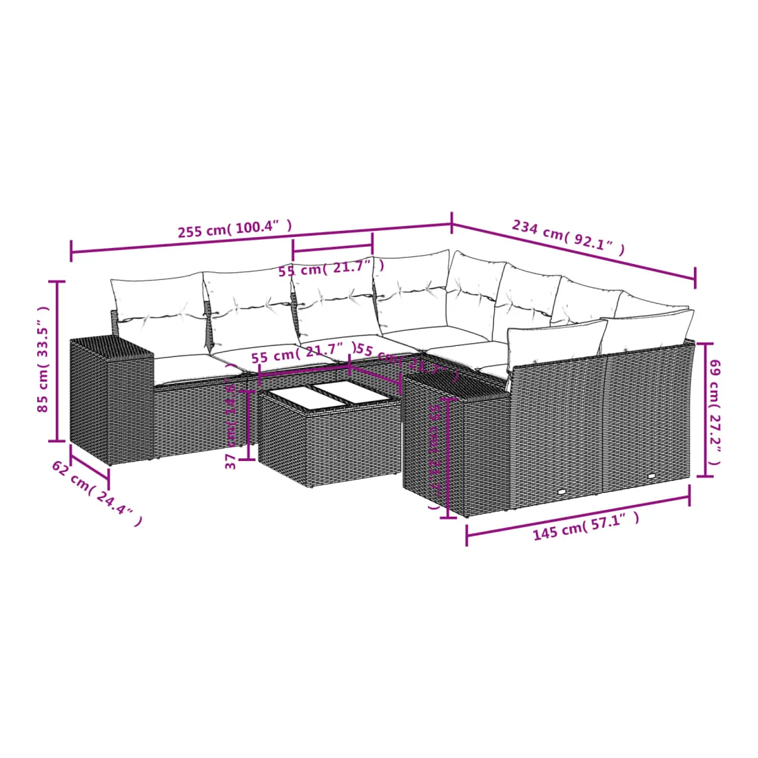 Cet ensemble de canapés de jardin est le complément parfait de votre arrière-cour, terrasse ou patio, offrant un espace confortable et accueillant pour discuter avec la famille et les amis ou simplement se détendre et profiter de l'extérieur. Matériau durable : la résine tressée, également connue sous le nom de poly rotin, est un matériau synthétique solide et nécessitant peu d'entretien qui ressemble au rotin naturel. Il est léger, facile à nettoyer et couramment utilisé pour les meubles d'extérieur en raison de sa durabilité et de ses propriétés de résistance aux intempéries.Fonction de rangement avec sac résistant à l'eau : le mobilier de jardin dispose d'un espace de rangement sous l'assise, complété par un sac résistant à l'eau pour ranger coussins, jouets et autres objets. Le sac intérieur peut être solidement fixé au mobilier d'extérieur grâce à des attaches auto-agrippantes pour plus de stabilité.Dessus en verre : le dessus de la table d'extérieur est fabriqué en verre trempé solide et durable, ce qui le rend facile à nettoyer avec un chiffon humide et ajoute une touche d'élégance à votre espace extérieur.Housse amovible et lavable : ces coussins de siège sont dotés de housses amovibles pour un lavage et un entretien faciles.Conception modulaire : cet ensemble de meubles d'extérieur a une conception modulaire, ce qui le rend complètement flexible et facile à déplacer, afin que vous puissiez créer un agencement de meubles d'extérieur personnalisé. Bon à savoir :Pour que vos meubles d'extérieur restent beaux, nous vous recommandons de les protéger avec une housse imperméable.
