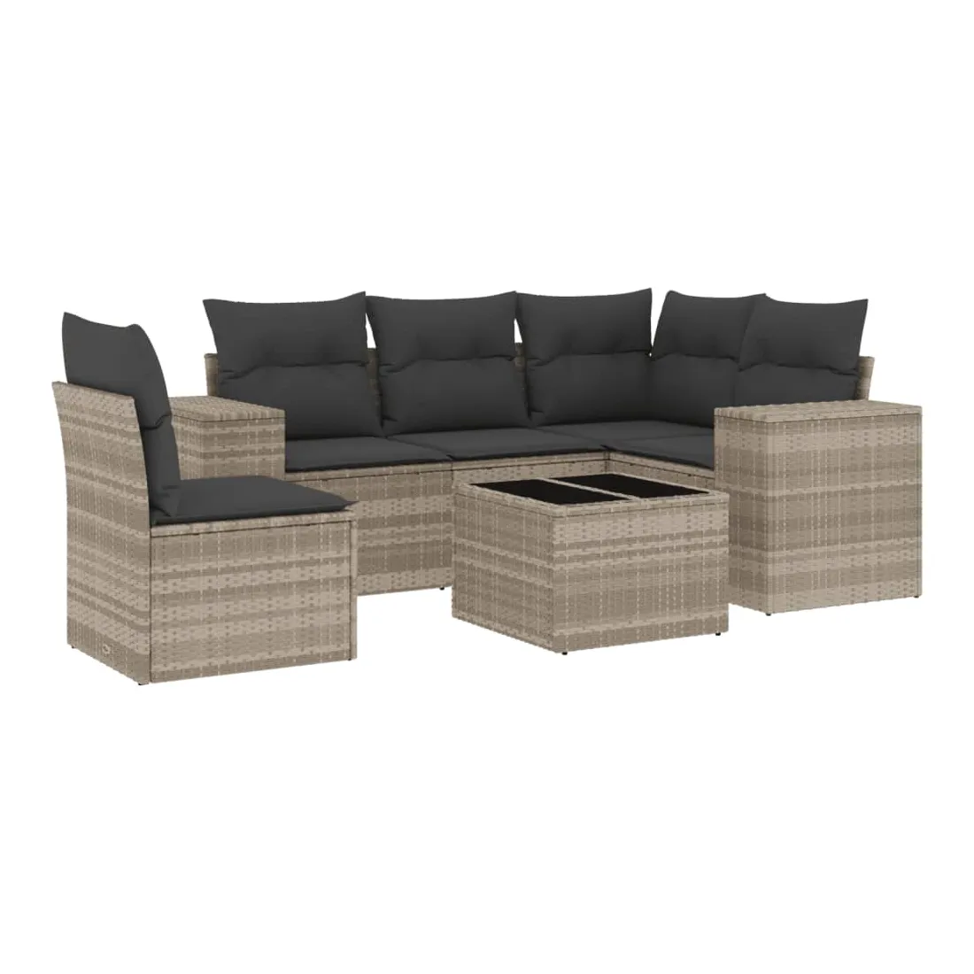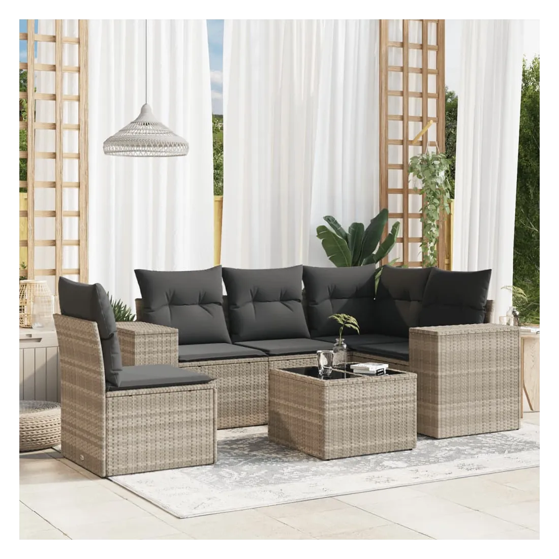 Cet ensemble de canapés de jardin est le complément parfait de votre arrière-cour, terrasse ou patio, offrant un espace confortable et accueillant pour discuter avec la famille et les amis ou simplement se détendre et profiter de l'extérieur. Matériau durable : la résine tressée, également connue sous le nom de poly rotin, est un matériau synthétique solide et nécessitant peu d'entretien qui ressemble au rotin naturel. Il est léger, facile à nettoyer et couramment utilisé pour les meubles d'extérieur en raison de sa durabilité et de ses propriétés de résistance aux intempéries.Fonction de rangement avec sac résistant à l'eau : le mobilier de jardin dispose d'un espace de rangement sous l'assise, complété par un sac résistant à l'eau pour ranger coussins, jouets et autres objets. Le sac intérieur peut être solidement fixé au mobilier d'extérieur grâce à des attaches auto-agrippantes pour plus de stabilité.Dessus en verre : le dessus de la table d'extérieur est fabriqué en verre trempé solide et durable, ce qui le rend facile à nettoyer avec un chiffon humide et ajoute une touche d'élégance à votre espace extérieur.Housse amovible et lavable : ces coussins de siège sont dotés de housses amovibles pour un lavage et un entretien faciles.Conception modulaire : cet ensemble de meubles d'extérieur a une conception modulaire, ce qui le rend complètement flexible et facile à déplacer, afin que vous puissiez créer un agencement de meubles d'extérieur personnalisé. Bon à savoir :Pour que vos meubles d'extérieur restent beaux, nous vous recommandons de les protéger avec une housse imperméable.
