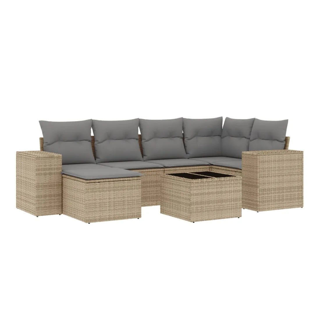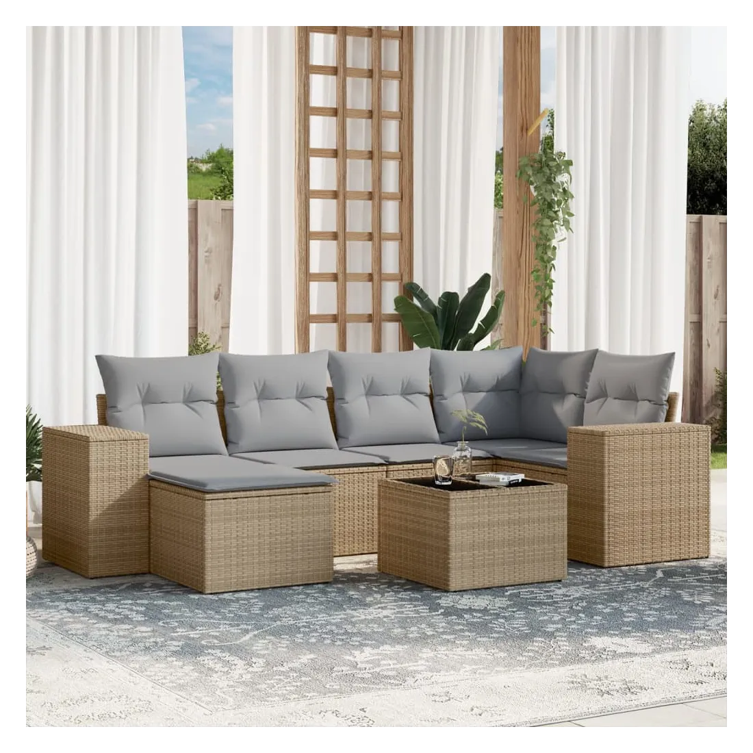 Cet ensemble de canapés de jardin est le complément parfait de votre arrière-cour, terrasse ou patio, offrant un espace confortable et accueillant pour discuter avec la famille et les amis ou simplement se détendre et profiter de l'extérieur. Matériau durable : la résine tressée, également connue sous le nom de poly rotin, est un matériau synthétique solide et nécessitant peu d'entretien qui ressemble au rotin naturel. Il est léger, facile à nettoyer et couramment utilisé pour les meubles d'extérieur en raison de sa durabilité et de ses propriétés de résistance aux intempéries.Fonction de rangement avec sac résistant à l'eau : le mobilier de jardin dispose d'un espace de rangement sous l'assise, complété par un sac résistant à l'eau pour ranger coussins, jouets et autres objets. Le sac intérieur peut être solidement fixé au mobilier d'extérieur grâce à des attaches auto-agrippantes pour plus de stabilité.Dessus en verre : le dessus de la table d'extérieur est fabriqué en verre trempé solide et durable, ce qui le rend facile à nettoyer avec un chiffon humide et ajoute une touche d'élégance à votre espace extérieur.Housse amovible et lavable : ces coussins de siège sont dotés de housses amovibles pour un lavage et un entretien faciles.Conception modulaire : cet ensemble de meubles d'extérieur a une conception modulaire, ce qui le rend complètement flexible et facile à déplacer, afin que vous puissiez créer un agencement de meubles d'extérieur personnalisé. Bon à savoir :Pour que vos meubles d'extérieur restent beaux, nous vous recommandons de les protéger avec une housse imperméable.