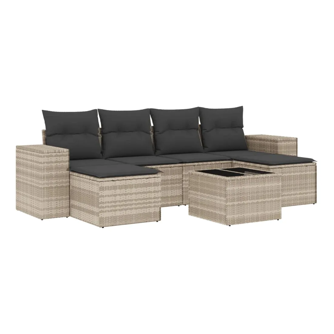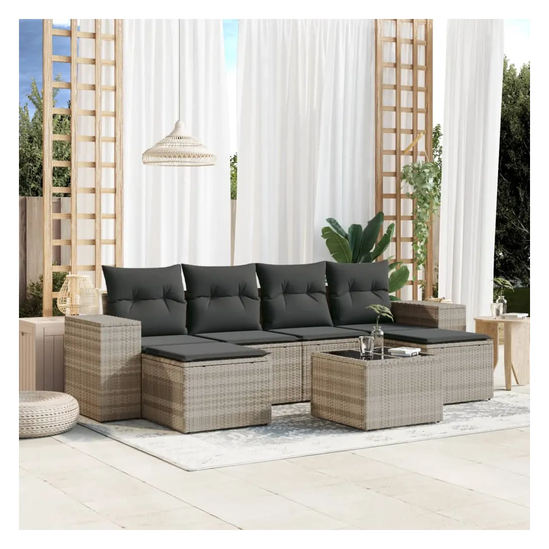 Cet ensemble de canapés de jardin est le complément parfait de votre arrière-cour, terrasse ou patio, offrant un espace confortable et accueillant pour discuter avec la famille et les amis ou simplement se détendre et profiter de l'extérieur. Matériau durable : la résine tressée, également connue sous le nom de poly rotin, est un matériau synthétique solide et nécessitant peu d'entretien qui ressemble au rotin naturel. Il est léger, facile à nettoyer et couramment utilisé pour les meubles d'extérieur en raison de sa durabilité et de ses propriétés de résistance aux intempéries.Fonction de rangement avec sac résistant à l'eau : le mobilier de jardin dispose d'un espace de rangement sous l'assise, complété par un sac résistant à l'eau pour ranger coussins, jouets et autres objets. Le sac intérieur peut être solidement fixé au mobilier d'extérieur grâce à des attaches auto-agrippantes pour plus de stabilité.Dessus en verre : le dessus de la table d'extérieur est fabriqué en verre trempé solide et durable, ce qui le rend facile à nettoyer avec un chiffon humide et ajoute une touche d'élégance à votre espace extérieur.Housse amovible et lavable : ces coussins de siège sont dotés de housses amovibles pour un lavage et un entretien faciles.Conception modulaire : cet ensemble de meubles d'extérieur a une conception modulaire, ce qui le rend complètement flexible et facile à déplacer, afin que vous puissiez créer un agencement de meubles d'extérieur personnalisé. Bon à savoir :Pour que vos meubles d'extérieur restent beaux, nous vous recommandons de les protéger avec une housse imperméable.
