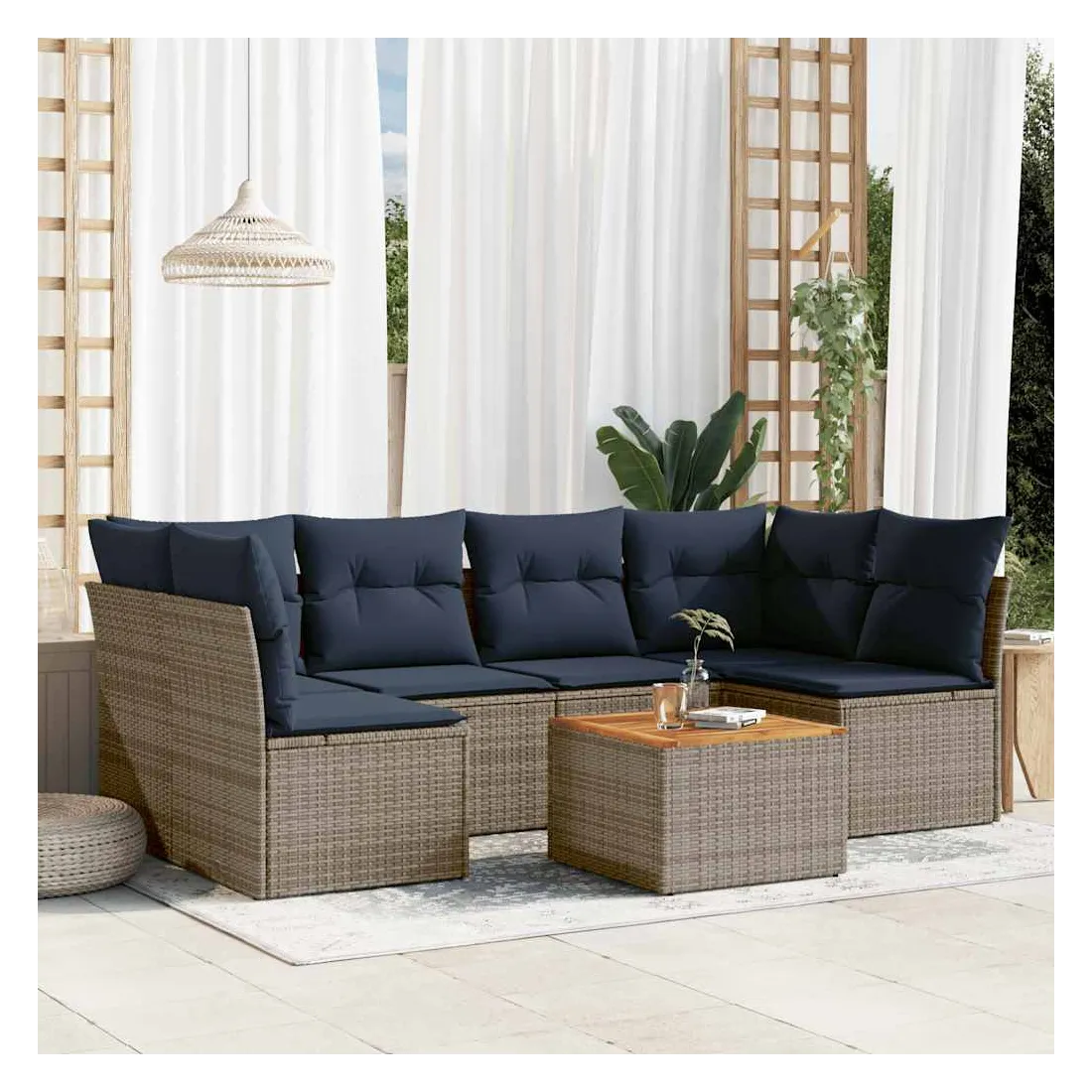 Cet ensemble de canapés de jardin est le complément parfait de votre arrière-cour, terrasse ou patio, offrant un espace confortable et accueillant pour discuter avec la famille et les amis ou simplement se détendre et profiter de l'extérieur. Matériau durable : la résine tressée, également connue sous le nom de poly rotin, est un matériau synthétique solide et nécessitant peu d'entretien qui ressemble au rotin naturel. Il est léger, facile à nettoyer et couramment utilisé pour les meubles d'extérieur en raison de sa durabilité et de ses propriétés de résistance aux intempéries.Fonction de rangement avec sac résistant à l'eau : chaque siège de jardin dispose d'un espace de rangement sous l'assise, complété par un sac résistant à l'eau pour ranger les coussins, les jouets et d'autres objets. Les sacs intérieurs sont dotés d'un couvercle et peuvent être solidement fixés aux sièges à l'aide de bandes auto-agrippantes pour plus de stabilité.Dessus stable et facile à nettoyer : cette table de jardin a un dessus en bois d'acacia robuste, durable et facile à nettoyer avec un chiffon humide.Housse amovible et lavable : ces coussins de siège sont dotés de housses amovibles pour un lavage et un entretien faciles.Conception modulaire : cet ensemble de meubles d'extérieur a une conception modulaire, ce qui le rend complètement flexible et facile à déplacer, afin que vous puissiez créer un agencement de meubles d'extérieur personnalisé. Bon à savoir :Pour que vos meubles d'extérieur restent beaux, nous vous recommandons de les protéger avec une housse imperméable.