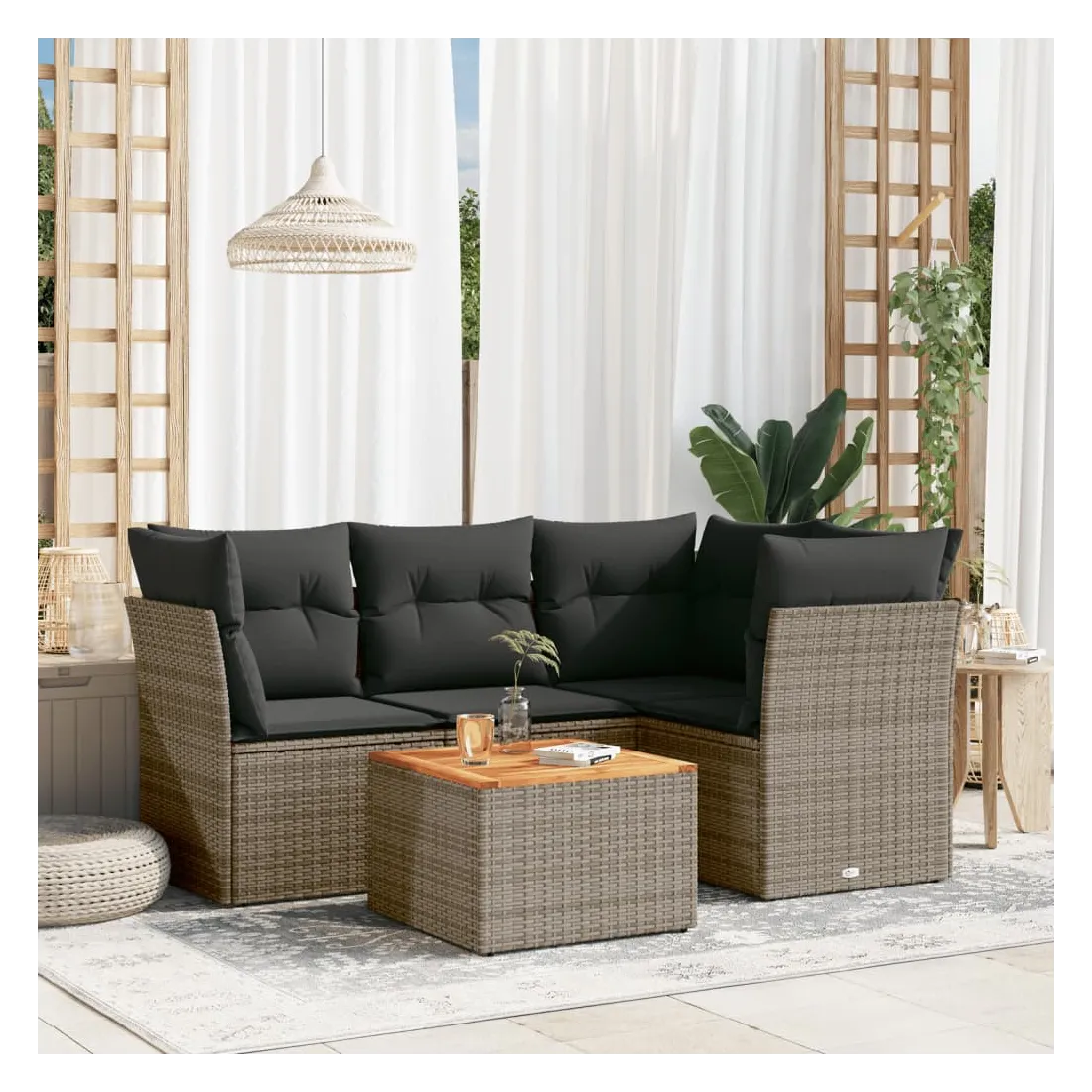 Cet ensemble de canapés de jardin est le complément parfait de votre arrière-cour, terrasse ou patio, offrant un espace confortable et accueillant pour discuter avec la famille et les amis ou simplement se détendre et profiter de l'extérieur. Matériau durable : la résine tressée, également connue sous le nom de poly rotin, est un matériau synthétique solide et nécessitant peu d'entretien qui ressemble au rotin naturel. Il est léger, facile à nettoyer et couramment utilisé pour les meubles d'extérieur en raison de sa durabilité et de ses propriétés de résistance aux intempéries.Fonction de rangement avec sac résistant à l'eau : chaque siège de jardin dispose d'un espace de rangement sous l'assise, complété par un sac résistant à l'eau pour ranger les coussins, les jouets et d'autres objets. Les sacs intérieurs sont dotés d'un couvercle et peuvent être solidement fixés aux sièges à l'aide de bandes auto-agrippantes pour plus de stabilité.Dessus stable et facile à nettoyer : cette table de jardin a un dessus en bois d'acacia robuste, durable et facile à nettoyer avec un chiffon humide.Housse amovible et lavable : ces coussins de siège sont dotés de housses amovibles pour un lavage et un entretien faciles.Conception modulaire : cet ensemble de meubles d'extérieur a une conception modulaire, ce qui le rend complètement flexible et facile à déplacer, afin que vous puissiez créer un agencement de meubles d'extérieur personnalisé. Bon à savoir :Pour que vos meubles d'extérieur restent beaux, nous vous recommandons de les protéger avec une housse imperméable.