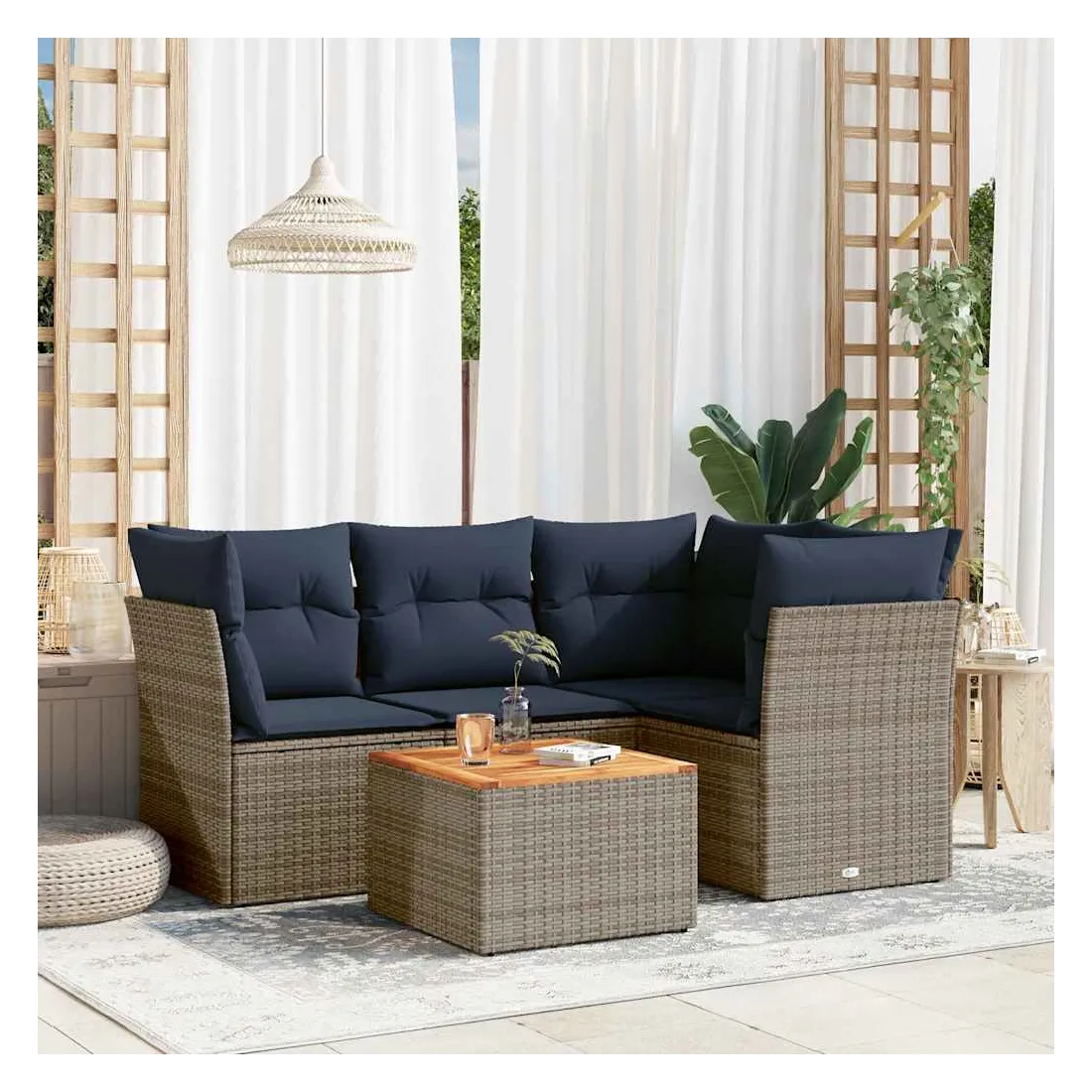 Cet ensemble de canapés de jardin est le complément parfait de votre arrière-cour, terrasse ou patio, offrant un espace confortable et accueillant pour discuter avec la famille et les amis ou simplement se détendre et profiter de l'extérieur. Matériau durable : la résine tressée, également connue sous le nom de poly rotin, est un matériau synthétique solide et nécessitant peu d'entretien qui ressemble au rotin naturel. Il est léger, facile à nettoyer et couramment utilisé pour les meubles d'extérieur en raison de sa durabilité et de ses propriétés de résistance aux intempéries.Fonction de rangement avec sac résistant à l'eau : chaque siège de jardin dispose d'un espace de rangement sous l'assise, complété par un sac résistant à l'eau pour ranger les coussins, les jouets et d'autres objets. Les sacs intérieurs sont dotés d'un couvercle et peuvent être solidement fixés aux sièges à l'aide de bandes auto-agrippantes pour plus de stabilité.Dessus stable et facile à nettoyer : cette table de jardin a un dessus en bois d'acacia robuste, durable et facile à nettoyer avec un chiffon humide.Housse amovible et lavable : ces coussins de siège sont dotés de housses amovibles pour un lavage et un entretien faciles.Conception modulaire : cet ensemble de meubles d'extérieur a une conception modulaire, ce qui le rend complètement flexible et facile à déplacer, afin que vous puissiez créer un agencement de meubles d'extérieur personnalisé. Bon à savoir :Pour que vos meubles d'extérieur restent beaux, nous vous recommandons de les protéger avec une housse imperméable.