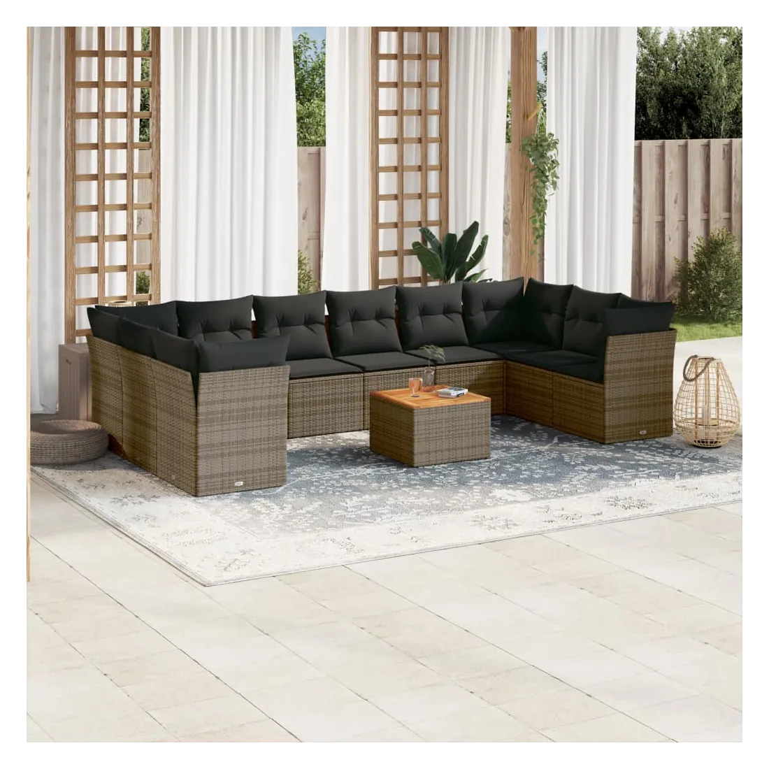 Cet ensemble de canapés de jardin est le complément parfait de votre arrière-cour, terrasse ou patio, offrant un espace confortable et accueillant pour discuter avec la famille et les amis ou simplement se détendre et profiter de l'extérieur. Matériau durable : la résine tressée, également connue sous le nom de poly rotin, est un matériau synthétique solide et nécessitant peu d'entretien qui ressemble au rotin naturel. Il est léger, facile à nettoyer et couramment utilisé pour les meubles d'extérieur en raison de sa durabilité et de ses propriétés de résistance aux intempéries.Fonction de rangement avec sac résistant à l'eau : chaque siège de jardin dispose d'un espace de rangement sous l'assise, complété par un sac résistant à l'eau pour ranger les coussins, les jouets et d'autres objets. Les sacs intérieurs sont dotés d'un couvercle et peuvent être solidement fixés aux sièges à l'aide de bandes auto-agrippantes pour plus de stabilité.Dessus stable et facile à nettoyer : cette table de jardin a un dessus en bois d'acacia robuste, durable et facile à nettoyer avec un chiffon humide.Housse amovible et lavable : ces coussins de siège sont dotés de housses amovibles pour un lavage et un entretien faciles.Conception modulaire : cet ensemble de meubles d'extérieur a une conception modulaire, ce qui le rend complètement flexible et facile à déplacer, afin que vous puissiez créer un agencement de meubles d'extérieur personnalisé. Bon à savoir :Pour que vos meubles d'extérieur restent beaux, nous vous recommandons de les protéger avec une housse imperméable.